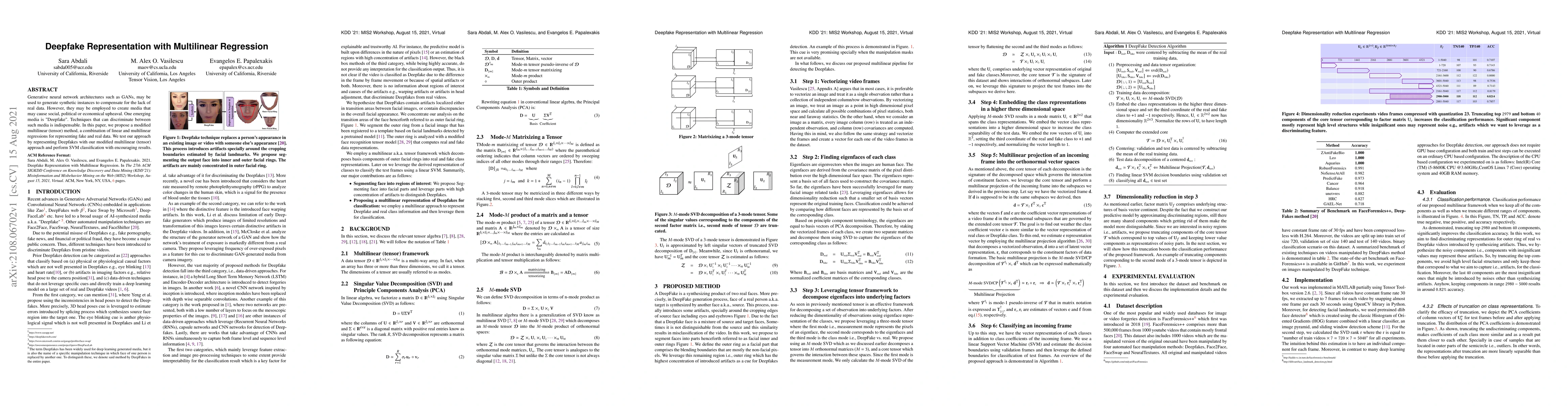 Generative neural network architectures such as GANs, may be used to generate synthetic instances to compensate for the lack of real data. However, they may be employed to create media that may cause social, political or economical upheaval. One emerging media is "Deepfake".Techniques that can discriminate between such media is indispensable. In this paper, we propose a modified multilinear (tensor) method, a combination of linear and multilinear regressions for representing fake and real data. We test our approach by representing Deepfakes with our modified multilinear (tensor) approach and perform SVM classification with encouraging results.