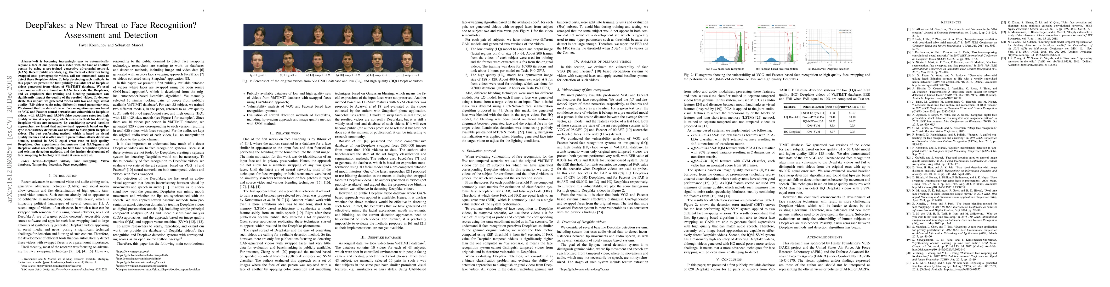 It is becoming increasingly easy to automatically replace a face of one person in a video with the face of another person by using a pre-trained generative adversarial network (GAN). Recent public scandals, e.g., the faces of celebrities being swapped onto pornographic videos, call for automated ways to detect these Deepfake videos. To help developing such methods, in this paper, we present the first publicly available set of Deepfake videos generated from videos of VidTIMIT database. We used open source software based on GANs to create the Deepfakes, and we emphasize that training and blending parameters can significantly impact the quality of the resulted videos. To demonstrate this impact, we generated videos with low and high visual quality (320 videos each) using differently tuned parameter sets. We showed that the state of the art face recognition systems based on VGG and Facenet neural networks are vulnerable to Deepfake videos, with 85.62% and 95.00% false acceptance rates respectively, which means methods for detecting Deepfake videos are necessary. By considering several baseline approaches, we found that audio-visual approach based on lip-sync inconsistency detection was not able to distinguish Deepfake videos. The best performing method, which is based on visual quality metrics and is often used in presentation attack detection domain, resulted in 8.97% equal error rate on high quality Deepfakes. Our experiments demonstrate that GAN-generated Deepfake videos are challenging for both face recognition systems and existing detection methods, and the further development of face swapping technology will make it even more so.