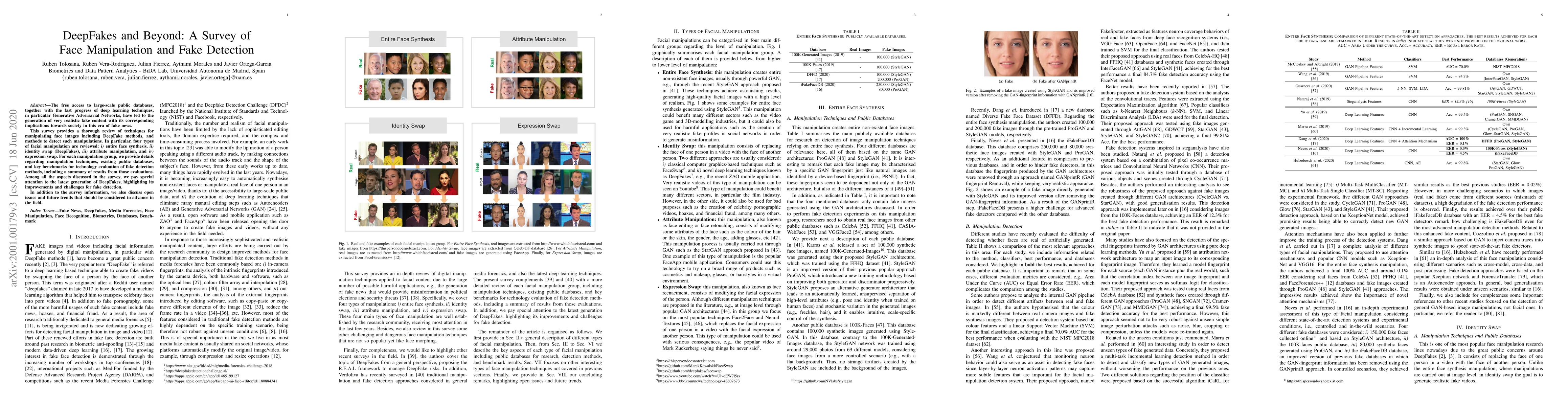 This survey reviews techniques for generating and detecting manipulated face images, focusing on DeepFakes and other methods like identity swap, attribute manipulation, and expression swap. It highlights advancements in deep learning and discusses existing databases and benchmarks for evaluating detection methods, emphasizing the latest DeepFakes and their challenges.