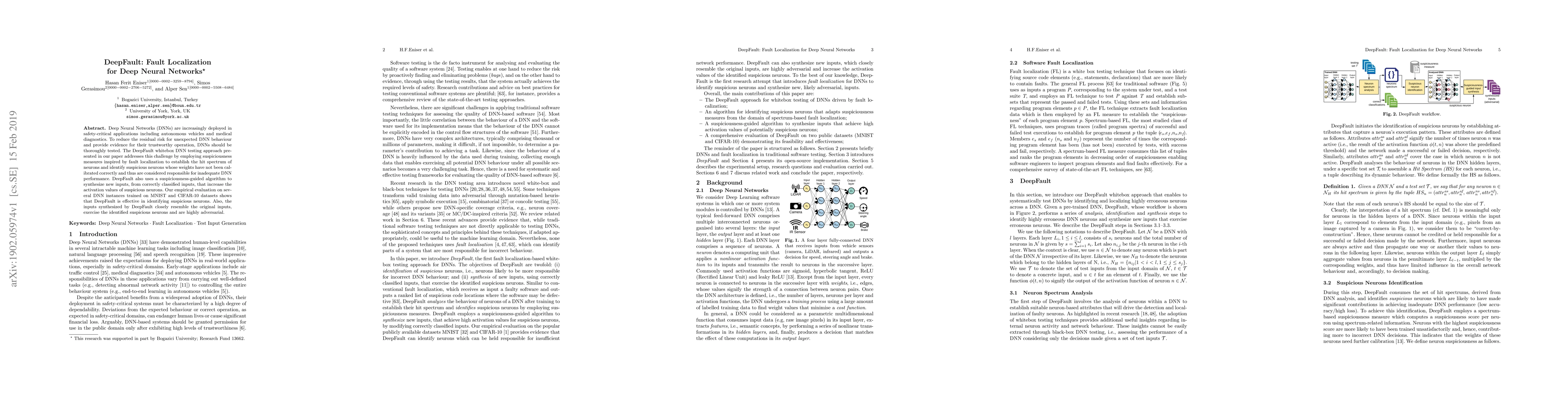 DeepFault is a whitebox testing approach for Deep Neural Networks (DNNs) that uses suspiciousness measures to identify neurons with uncalibrated weights responsible for inadequate performance. It also synthesizes adversarial inputs that activate these neurons, demonstrating effectiveness on MNIST and CIFAR-10 datasets.
