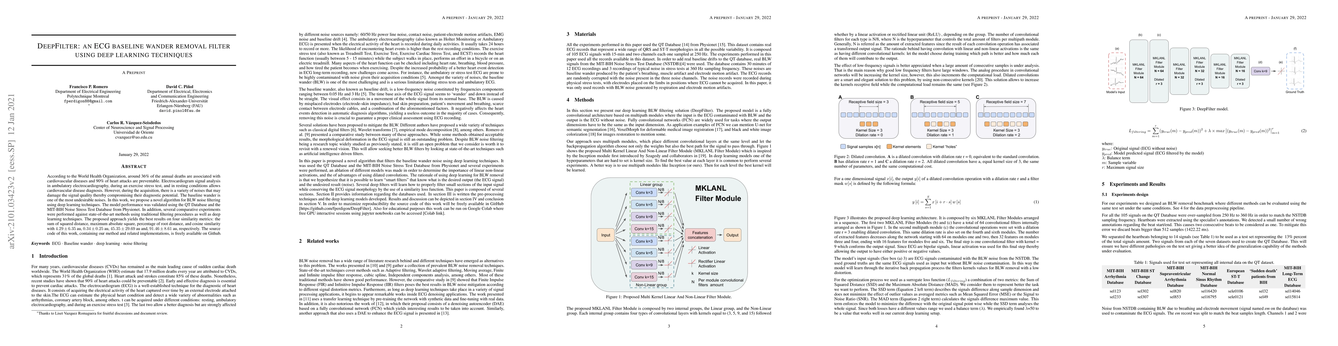 According to the World Health Organization, around 36% of the annual deaths are associated with cardiovascular diseases and 90% of heart attacks are preventable. Electrocardiogram signal analysis in ambulatory electrocardiography, during an exercise stress test, and in resting conditions allows cardiovascular disease diagnosis. However, during the acquisition, there is a variety of noises that may damage the signal quality thereby compromising their diagnostic potential. The baseline wander is one of the most undesirable noises. In this work, we propose a novel algorithm for BLW noise filtering using deep learning techniques. The model performance was validated using the QT Database and the MIT-BIH Noise Stress Test Database from Physionet. In addition, several comparative experiments were performed against state-of-the-art methods using traditional filtering procedures as well as deep learning techniques. The proposed approach yields the best results on four similarity metrics: the sum of squared distance, maximum absolute square, percentage of root distance, and cosine similarity with 4.29 (6.35) au, 0.34 (0.25) au, 45.35 (29.69) au and, 91.46 (8.61) au, respectively. The source code of this work, containing our method and related implementations, is freely available on Github.