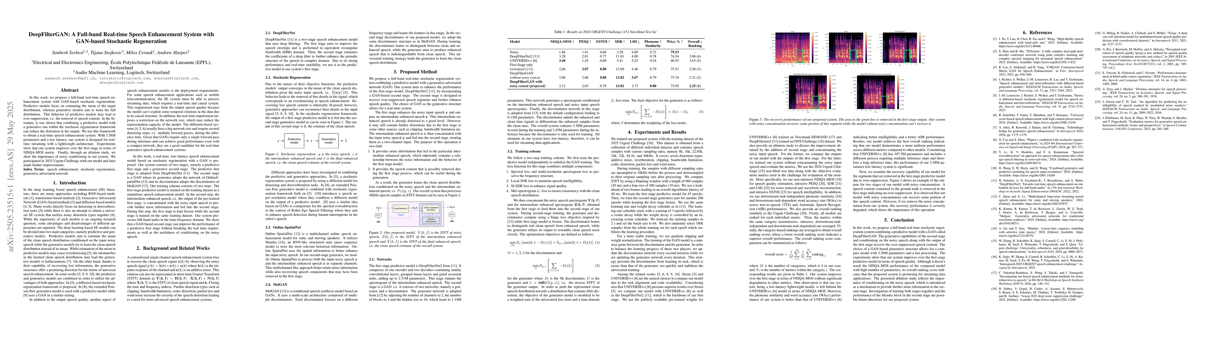 Researchers propose a real-time speech enhancement system using GAN-based stochastic regeneration to improve audio quality and reduce latency. The system outperforms traditional methods in terms of NISQA-MOS metric.