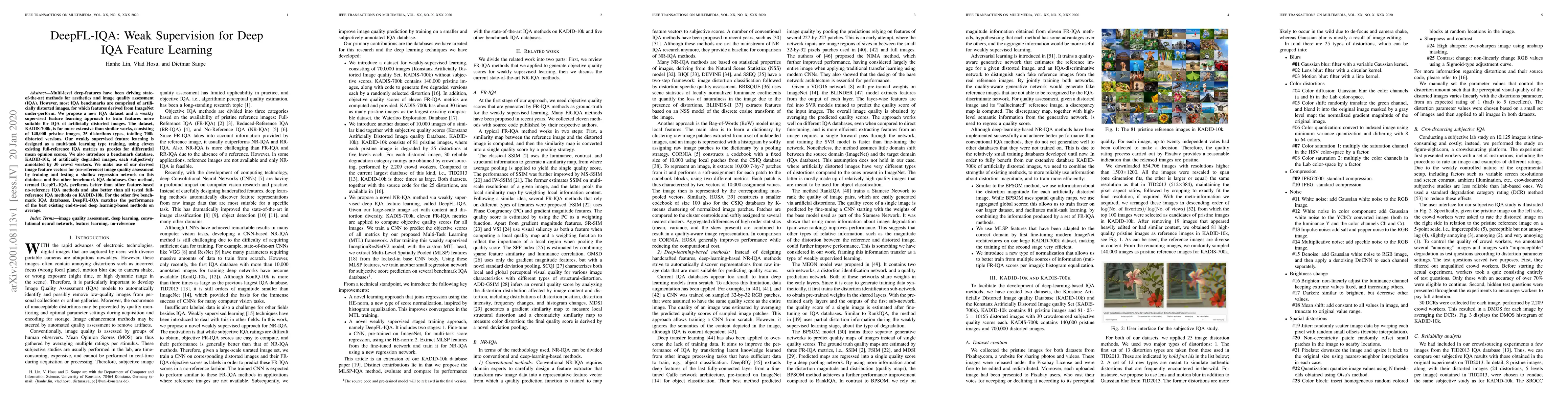 Multi-level deep-features have been driving state-of-the-art methods for aesthetics and image quality assessment (IQA). However, most IQA benchmarks are comprised of artificially distorted images, for which features derived from ImageNet under-perform. We propose a new IQA dataset and a weakly supervised feature learning approach to train features more suitable for IQA of artificially distorted images. The dataset, KADIS-700k, is far more extensive than similar works, consisting of 140,000 pristine images, 25 distortions types, totaling 700k distorted versions. Our weakly supervised feature learning is designed as a multi-task learning type training, using eleven existing full-reference IQA metrics as proxies for differential mean opinion scores. We also introduce a benchmark database, KADID-10k, of artificially degraded images, each subjectively annotated by 30 crowd workers. We make use of our derived image feature vectors for (no-reference) image quality assessment by training and testing a shallow regression network on this database and five other benchmark IQA databases. Our method, termed DeepFL-IQA, performs better than other feature-based no-reference IQA methods and also better than all tested full-reference IQA methods on KADID-10k. For the other five benchmark IQA databases, DeepFL-IQA matches the performance of the best existing end-to-end deep learning-based methods on average.