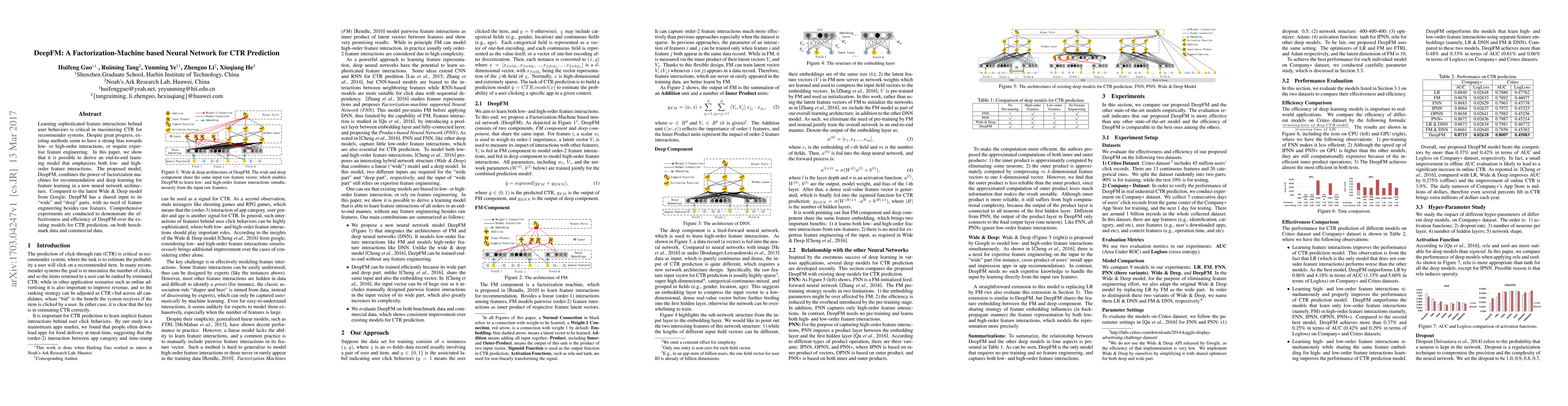 DeepFM integrates factorization machines with deep learning to capture both low- and high-order feature interactions for CTR prediction, eliminating the need for extensive feature engineering. Experiments show it outperforms existing models, including Google's Wide & Deep, on benchmark and commercial datasets.