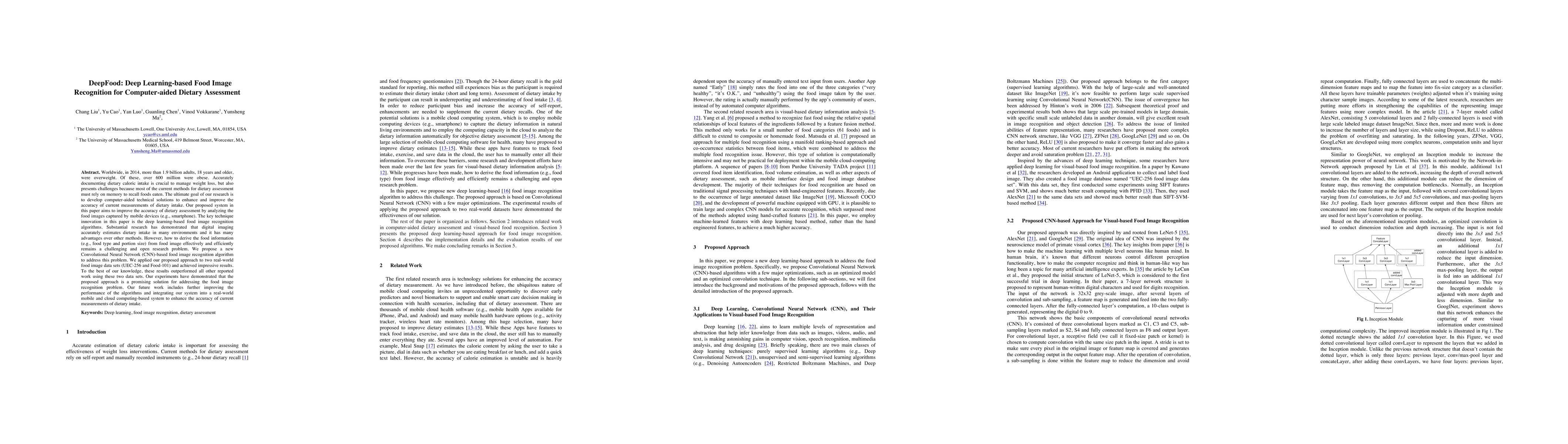 This paper proposes a deep learning-based food image recognition system, DeepFood, to improve dietary assessment accuracy by analyzing images captured via mobile devices. The developed Convolutional Neural Network (CNN) algorithm achieved superior results on two datasets, indicating potential for enhancing current dietary intake measurement methods.