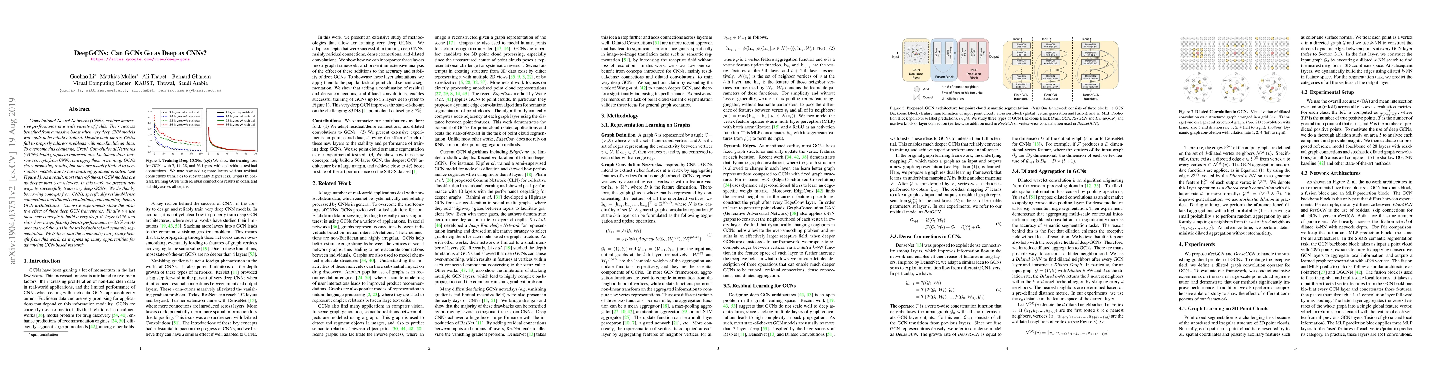 This paper proposes new methods to train deep Graph Convolutional Networks (GCNs) by adapting techniques from Convolutional Neural Networks (CNNs), such as residual/dense connections and dilated convolutions. The authors demonstrate that their deep GCN framework, including a 56-layer model, significantly improves performance in point cloud semantic segmentation, achieving a +3.7% mIoU gain over existing methods.