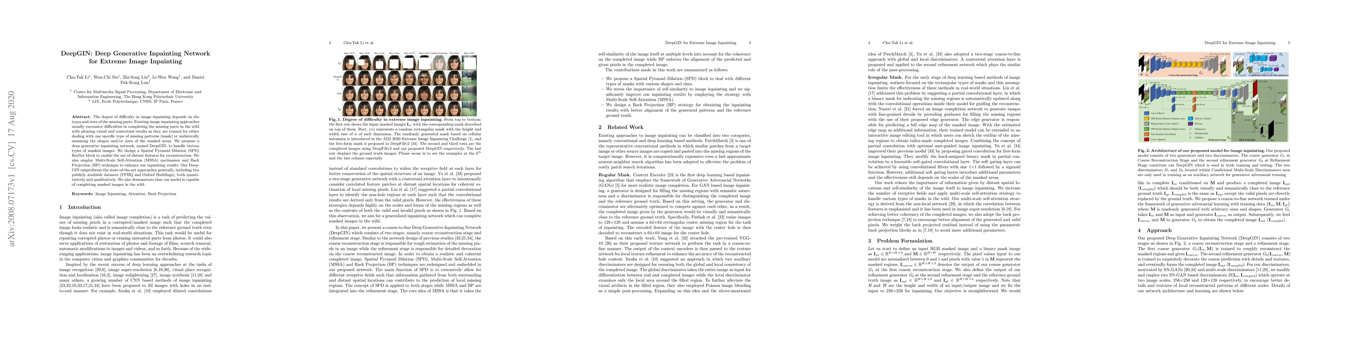 DeepGIN is a deep generative inpainting network designed to handle diverse missing parts in images, employing a Spatial Pyramid Dilation ResNet block and Multi-Scale Self-Attention mechanism. It outperforms existing methods on two datasets, demonstrating superior quantitative and qualitative results in extreme image inpainting.