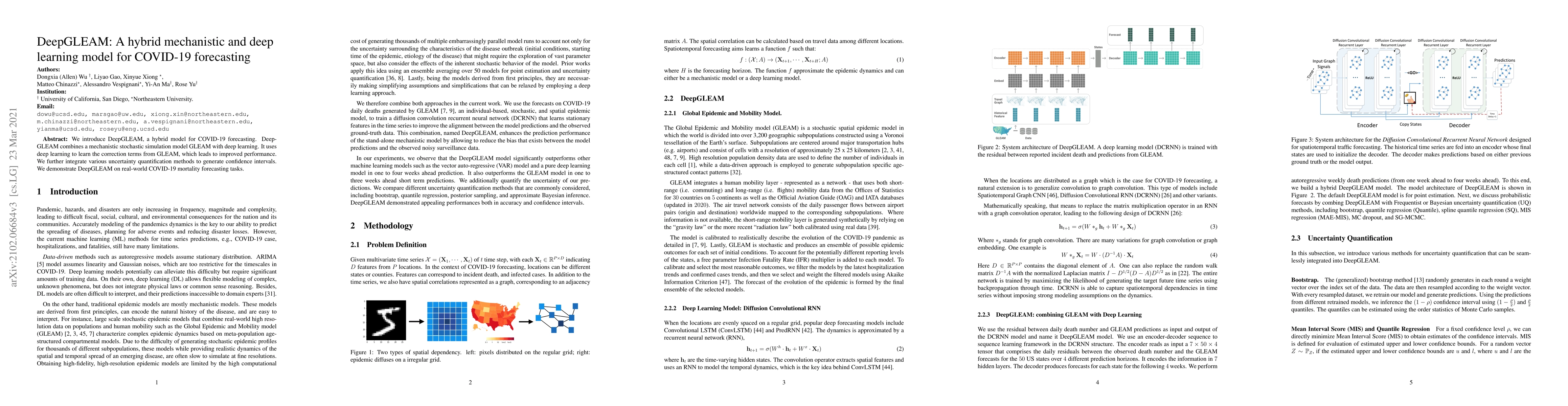 DeepGLEAM integrates a mechanistic stochastic simulation model with deep learning to enhance COVID-19 forecasting accuracy and provides uncertainty quantification through confidence intervals for real-world mortality predictions.