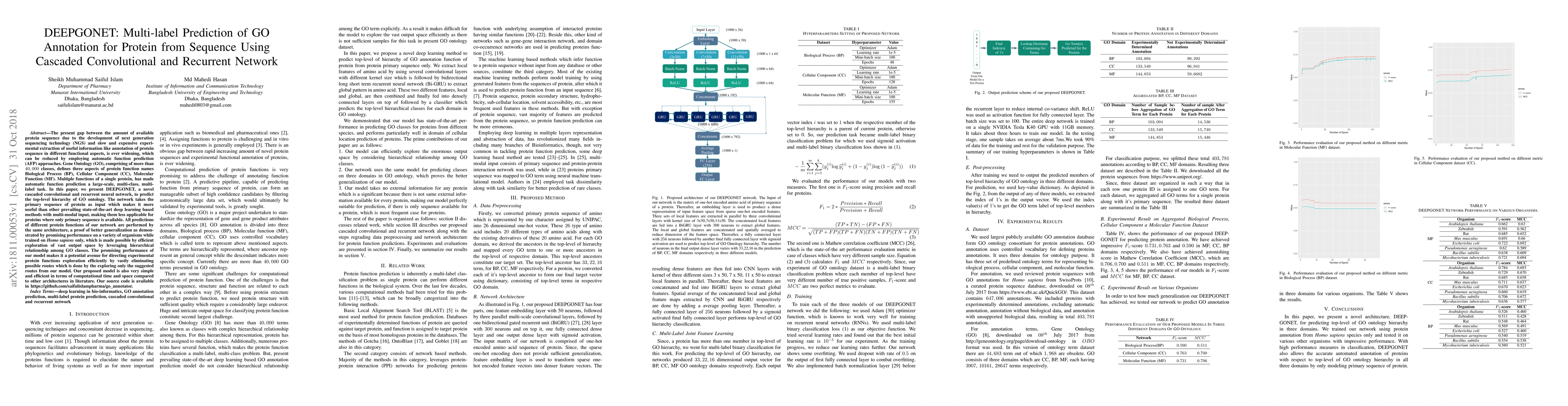 DEEPGONET employs a cascaded convolutional and recurrent neural network to predict protein function annotations from sequence data, addressing the gap between the rapid growth of protein sequences and the slow experimental extraction of functional information. The model efficiently predicts the top-level hierarchy of Gene Ontology classes, demonstrating promising performance across various organisms while trained on human proteins.