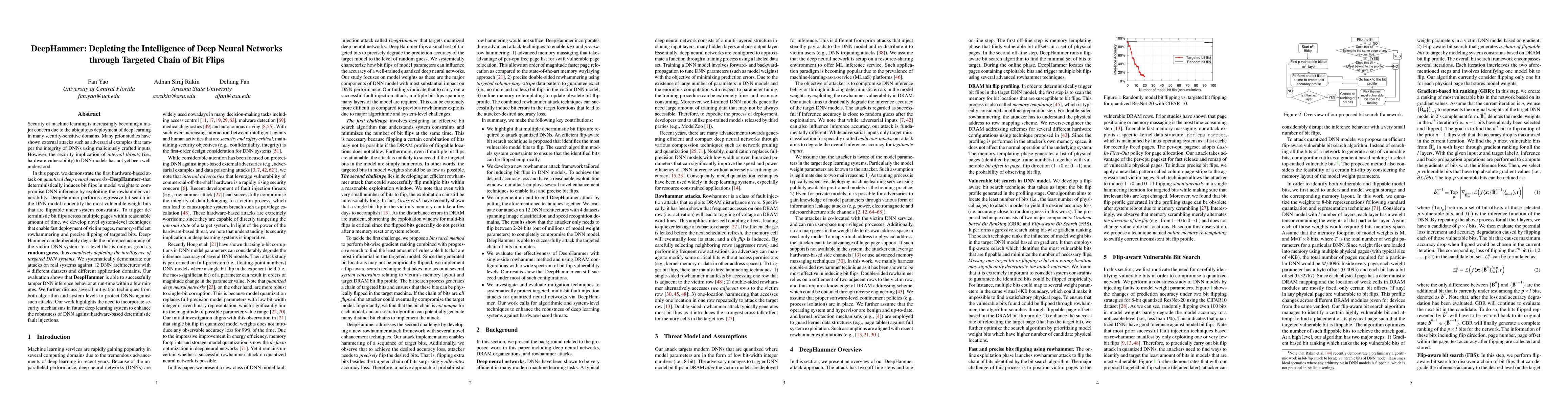 DeepHammer demonstrates a novel hardware-based attack exploiting rowhammer vulnerability to induce bit flips in quantized deep neural network weights, significantly degrading their inference accuracy. The study highlights the need for enhanced security mechanisms in deep learning systems to protect against hardware-induced threats.