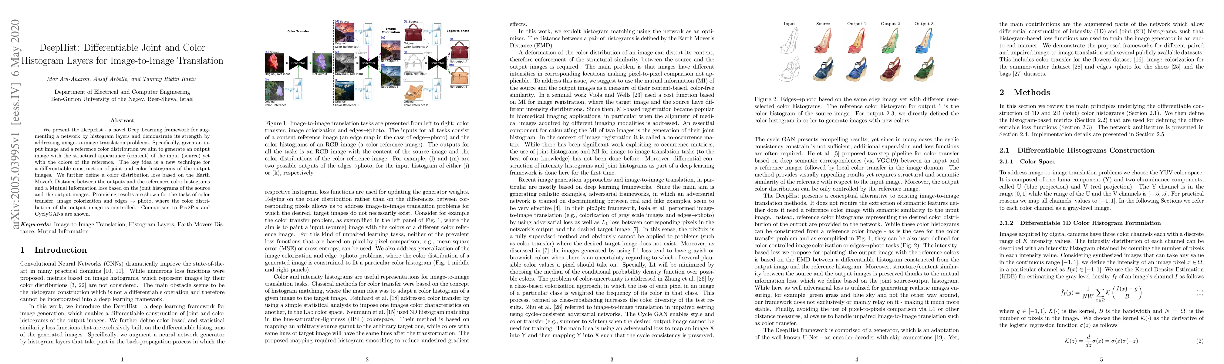We present the DeepHist - a novel Deep Learning framework for augmenting a network by histogram layers and demonstrate its strength by addressing image-to-image translation problems. Specifically, given an input image and a reference color distribution we aim to generate an output image with the structural appearance (content) of the input (source) yet with the colors of the reference. The key idea is a new technique for a differentiable construction of joint and color histograms of the output images. We further define a color distribution loss based on the Earth Mover's Distance between the output's and the reference's color histograms and a Mutual Information loss based on the joint histograms of the source and the output images. Promising results are shown for the tasks of color transfer, image colorization and edges $\rightarrow$ photo, where the color distribution of the output image is controlled. Comparison to Pix2Pix and CyclyGANs are shown.
