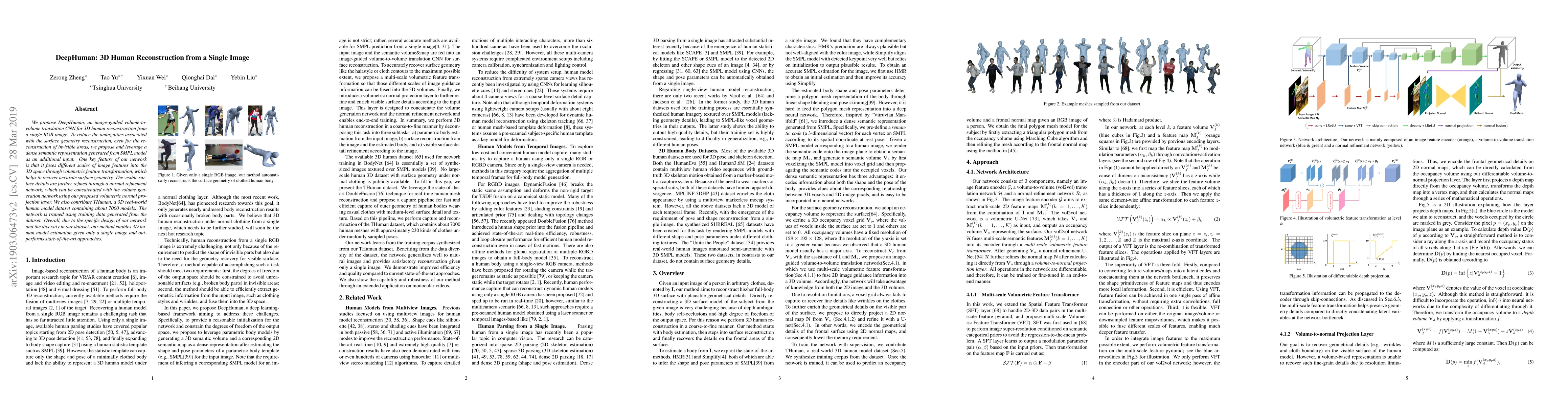 DeepHuman is a CNN that reconstructs 3D human models from single RGB images by fusing multi-scale image features into volumetric space. It leverages a dense semantic representation from SMPL and refines surface details using a normal refinement network, outperforming existing methods.