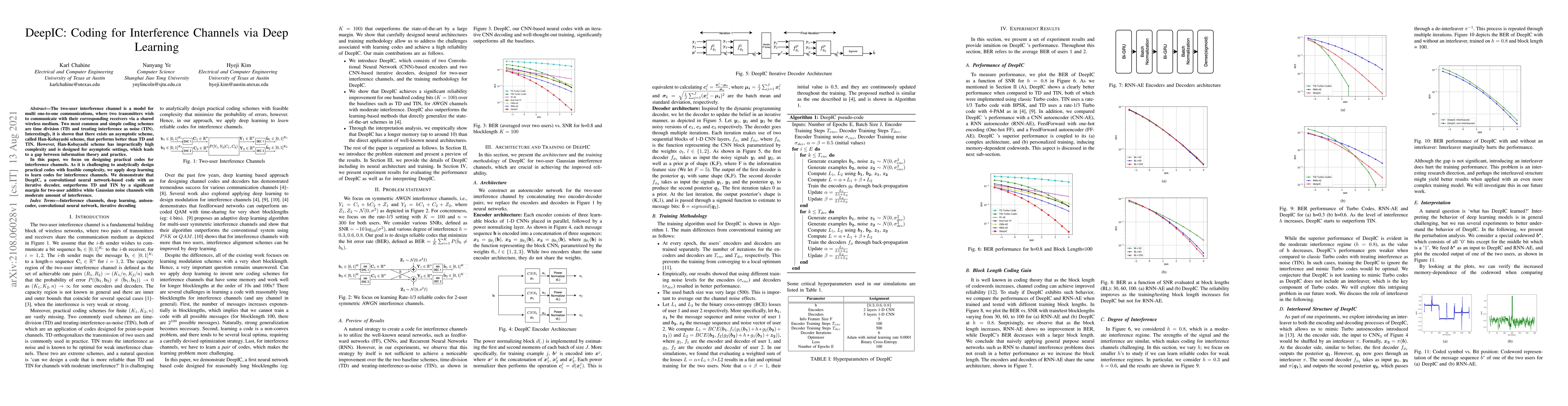 DeepIC, a CNN-based code with iterative decoders, designed for two-user Gaussian interference channels, showcasing improved reliability through careful neural architecture design and training methodology.