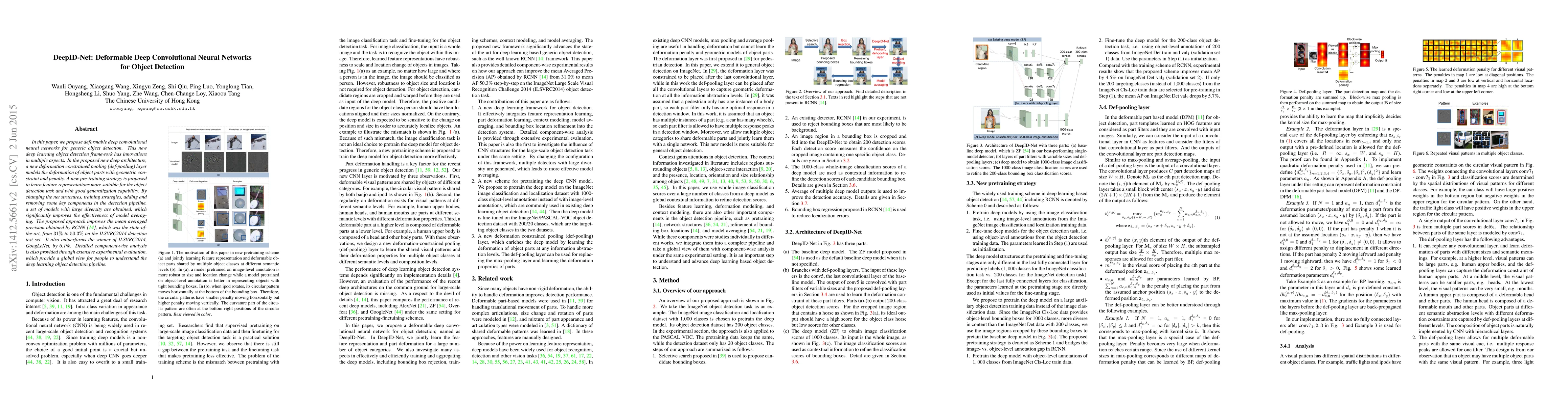 The paper introduces deformable deep convolutional neural networks (DeepID-Net) for enhanced object detection, featuring a novel def-pooling layer and a pre-training strategy. The proposed framework significantly improves detection performance, outperforming previous state-of-the-art methods on the ILSVRC2014 dataset.