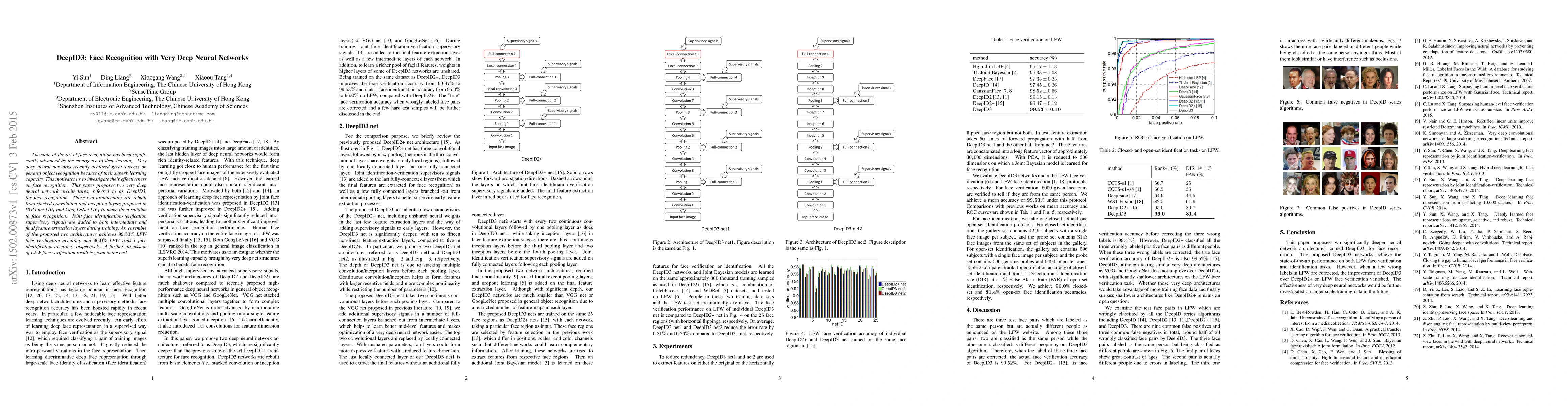 This paper proposes DeepID3, two very deep neural network architectures for face recognition, achieving 99.53% accuracy in LFW face verification and 96.0% rank-1 identification accuracy. The networks are adapted from VGG and GoogLeNet with added supervisory signals for improved performance.
