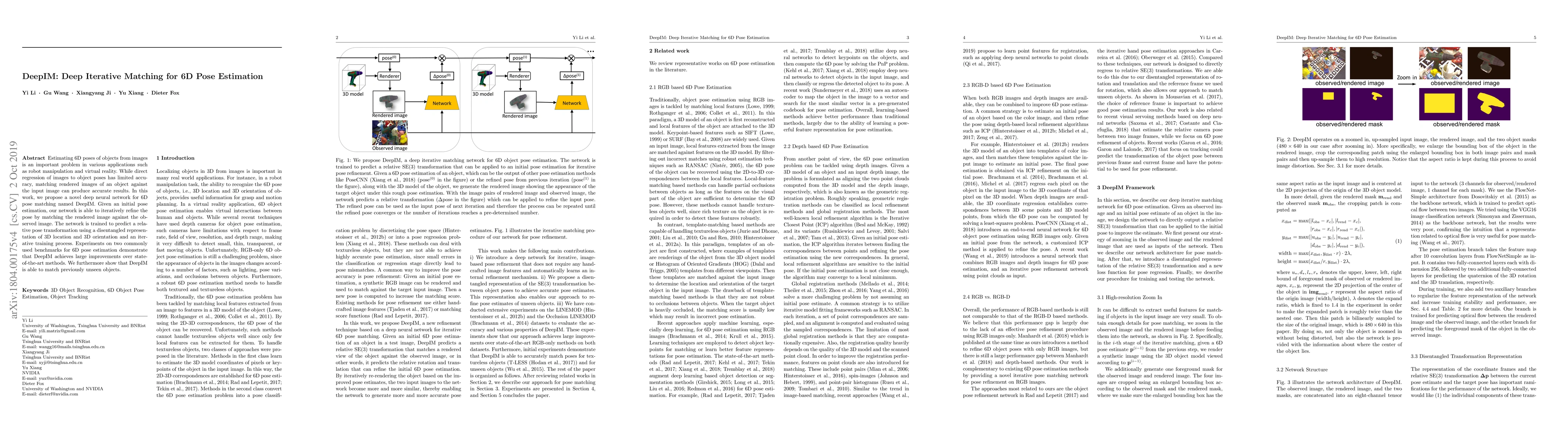 This paper introduces DeepIM, a novel deep neural network that iteratively refines 6D pose estimation by matching rendered images against observed ones, achieving large improvements over state-of-the-art methods.