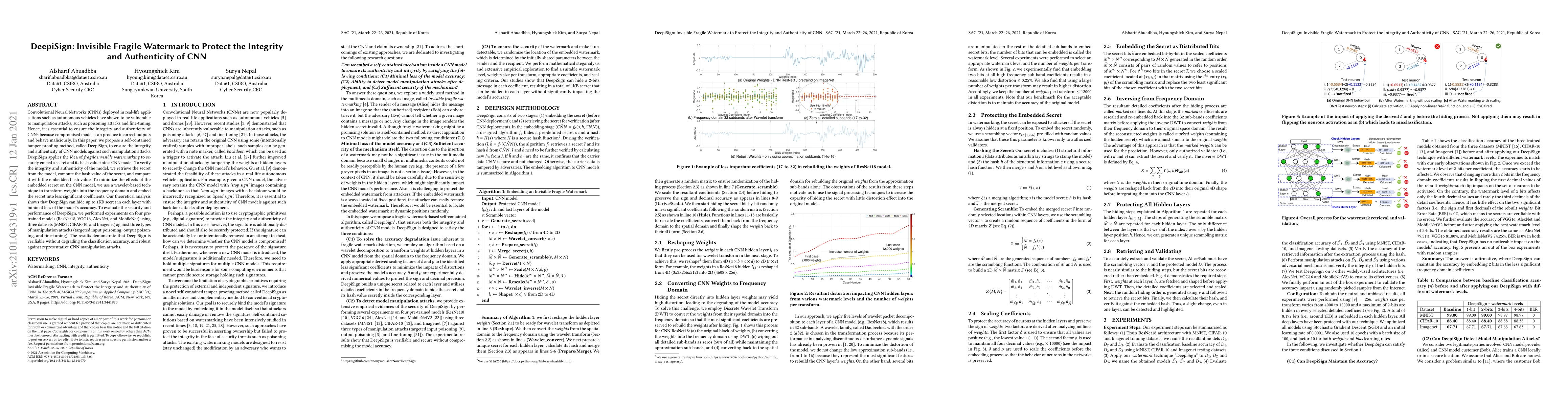DeepiSign is a method that embeds a secret and its hash into CNN models to ensure their integrity and authenticity against manipulation attacks. It uses wavelet transformation to minimize impact on model accuracy and has been tested successfully on various models and datasets, demonstrating robustness against different attack types without significant accuracy loss.
