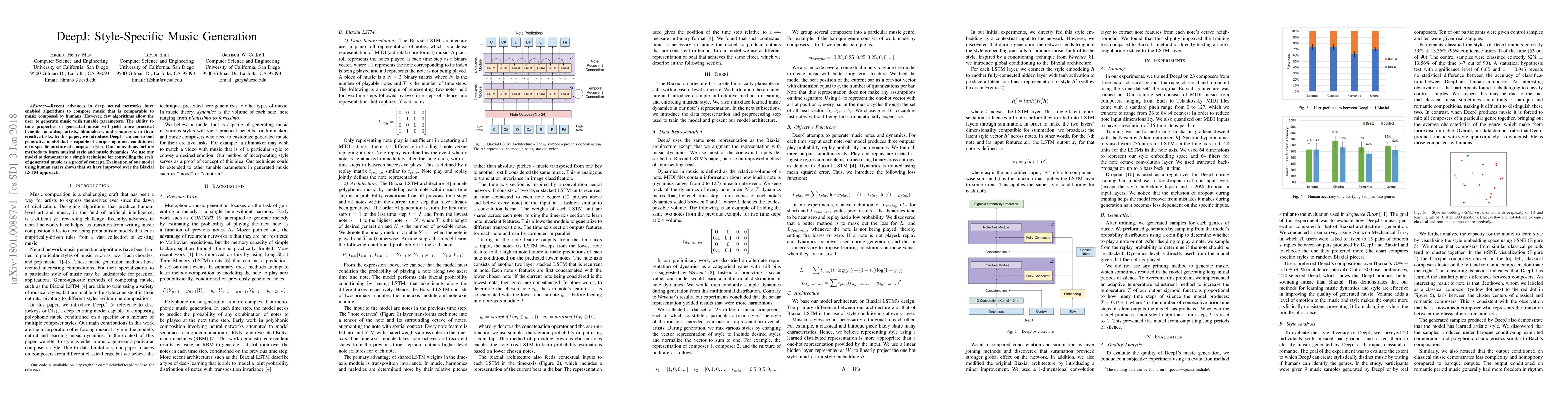 DeepJ is an end-to-end generative model that allows users to generate music conditioned on specific composer styles, offering tunable parameters for practical creative applications. Evaluations show it outperforms the Biaxial LSTM approach in style accuracy.