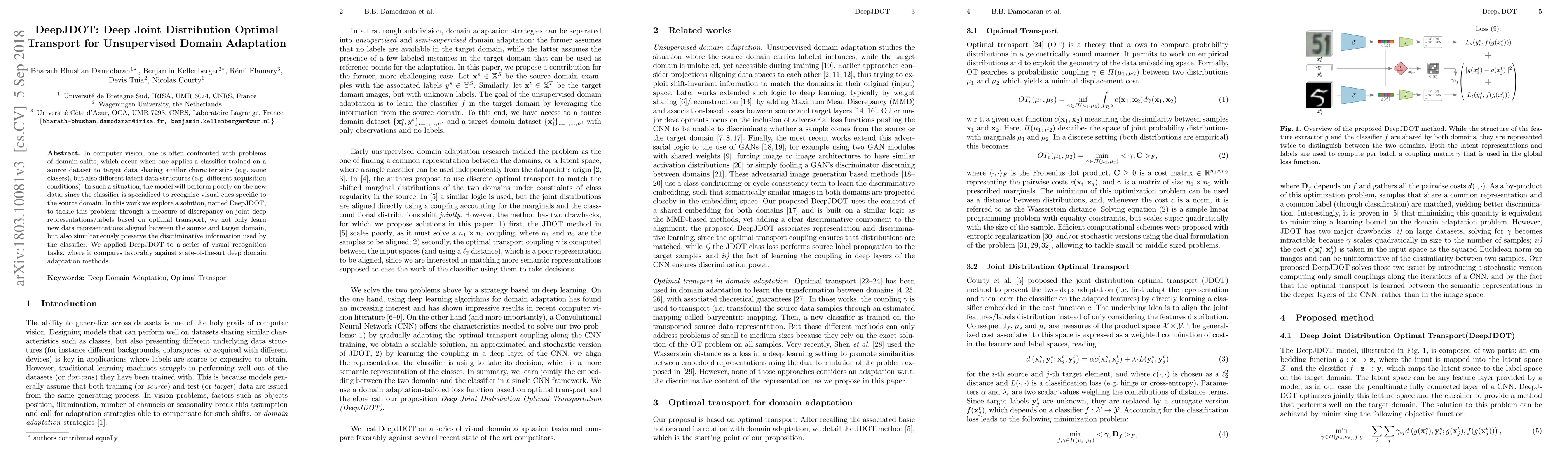 DeepJDOT tackles domain shift problems in computer vision by aligning source and target data representations through optimal transport, preserving discriminative information used by classifiers. It compares favorably to state-of-the-art deep domain adaptation methods.