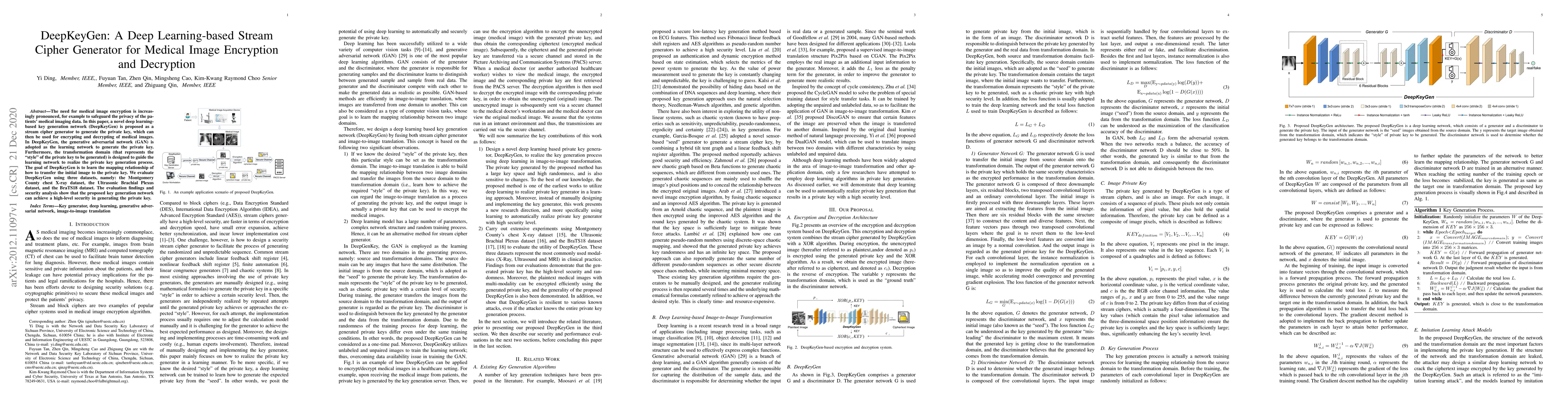 This paper proposes DeepKeyGen, a deep learning-based stream cipher generator using a GAN to create private keys for medical image encryption. Evaluations on three medical image datasets demonstrate high-level security in the generated keys.