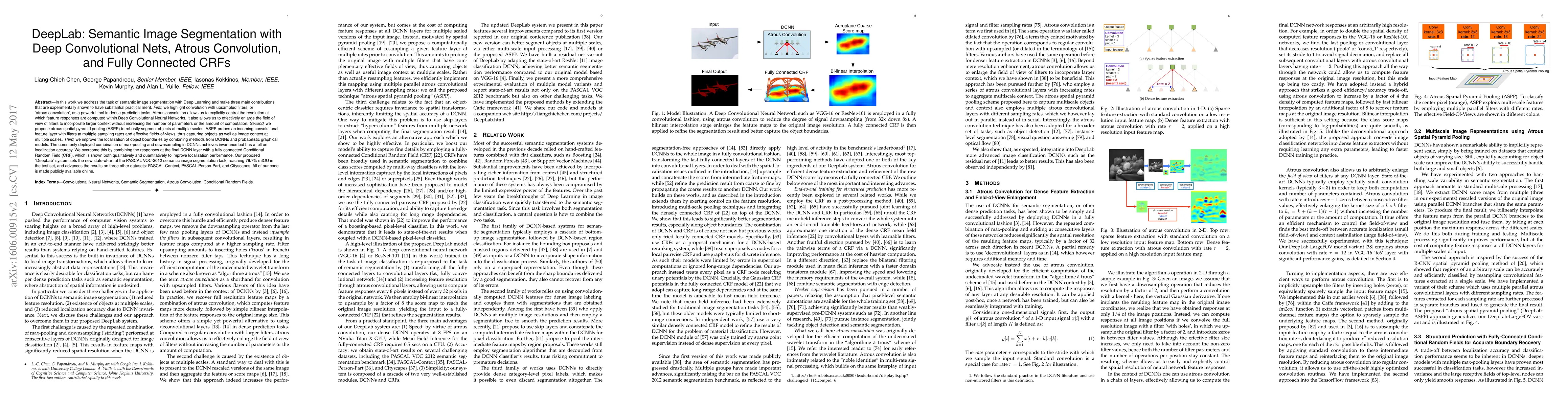 DeepLab introduces atrous convolution and atrous spatial pyramid pooling (ASPP) to enhance semantic image segmentation, achieving state-of-the-art results by improving both context incorporation and boundary localization through a combination of deep convolutional networks and fully connected CRFs.