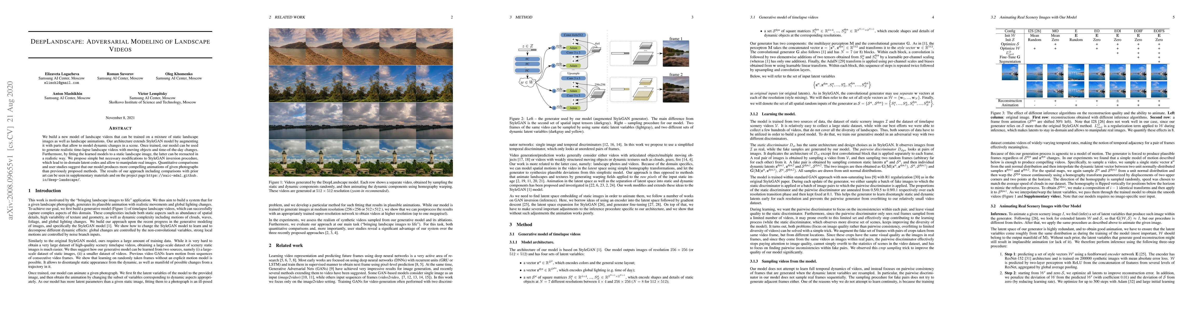 We build a new model of landscape videos that can be trained on a mixture of static landscape images as well as landscape animations. Our architecture extends StyleGAN model by augmenting it with parts that allow to model dynamic changes in a scene. Once trained, our model can be used to generate realistic time-lapse landscape videos with moving objects and time-of-the-day changes. Furthermore, by fitting the learned models to a static landscape image, the latter can be reenacted in a realistic way. We propose simple but necessary modifications to StyleGAN inversion procedure, which lead to in-domain latent codes and allow to manipulate real images. Quantitative comparisons and user studies suggest that our model produces more compelling animations of given photographs than previously proposed methods. The results of our approach including comparisons with prior art can be seen in supplementary materials and on the project page https://saic-mdal.github.io/deep-landscape