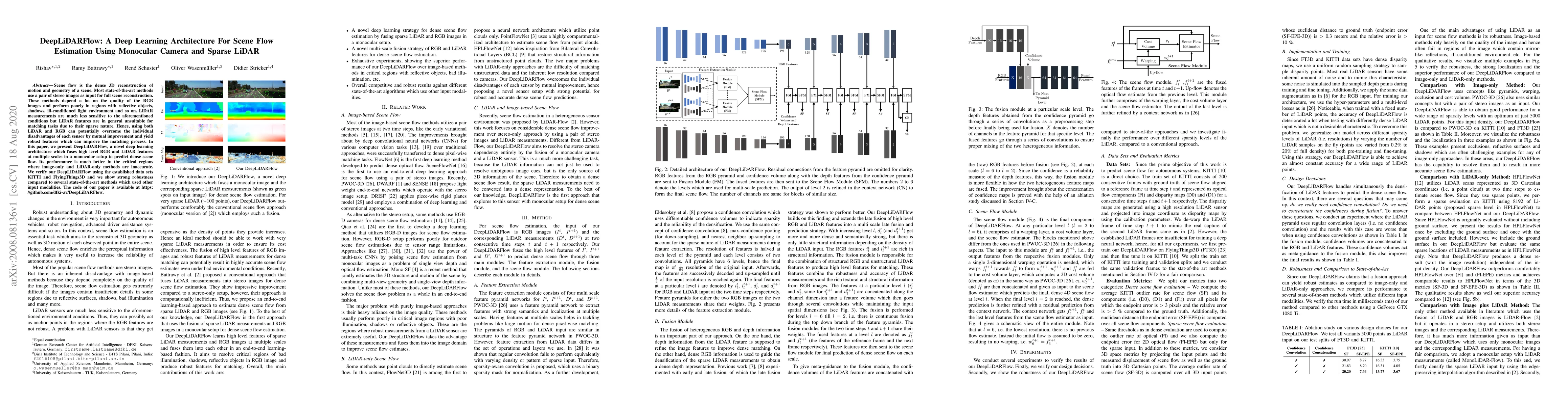 DeepLiDARFlow is a deep learning architecture that integrates monocular RGB and sparse LiDAR data to estimate dense scene flow, demonstrating improved performance in challenging conditions compared to methods relying solely on RGB or LiDAR. The approach shows robust results on KITTI and FlyingThings3D datasets.