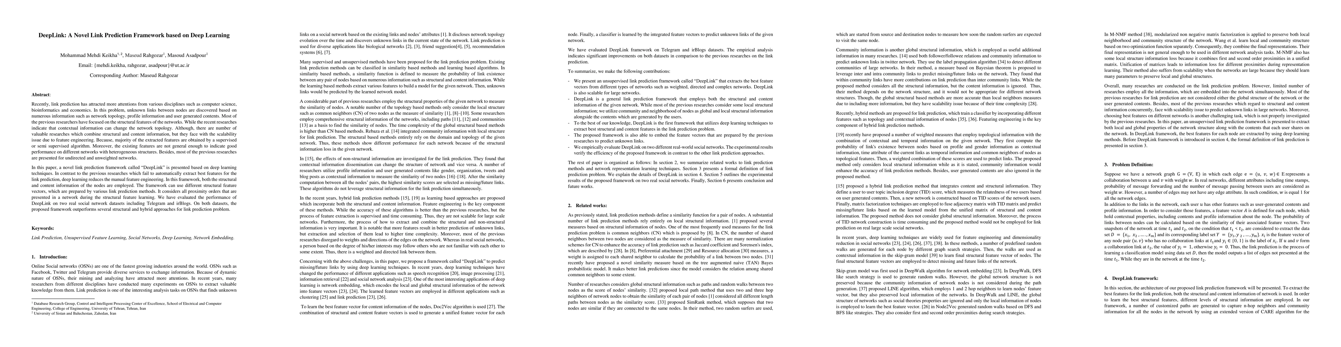 DeepLink is a novel link prediction framework based on deep learning that integrates both structural and content information to predict unknown links in networks. Unlike previous methods, it reduces the need for manual feature engineering and demonstrates superior performance on diverse network structures.