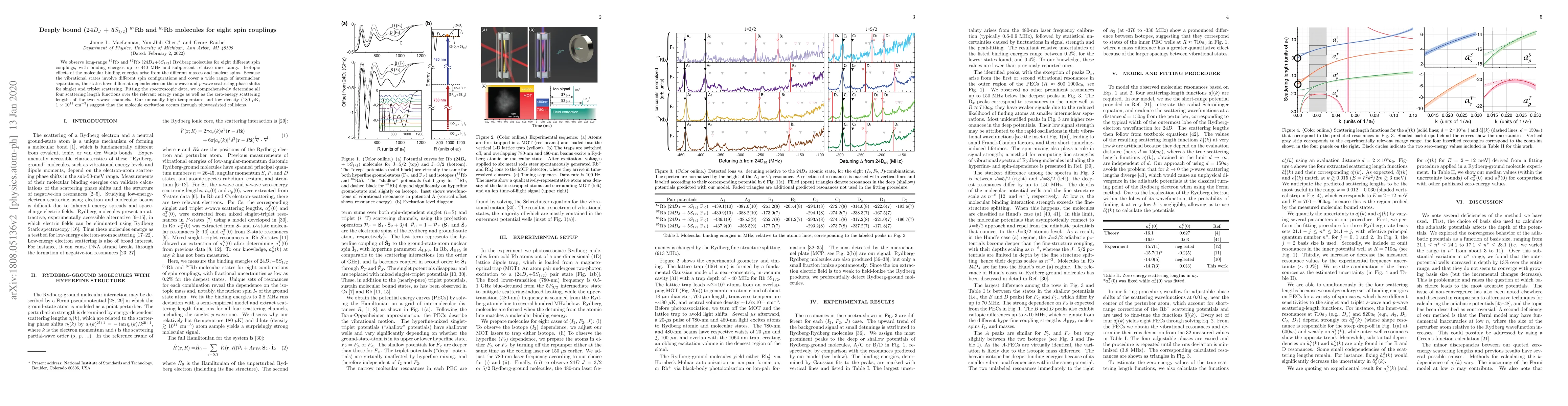 We observe long-range $^{85}$Rb and $^{87}$Rb (24$D$+5$S_{1/2}$) Rydberg molecules for eight different spin couplings, with binding energies up to 440~MHz and sub-percent relative uncertainty. Isotopic effects of the molecular binding energies arise from the different masses and nuclear spins. Because the vibrational states involve different spin configurations and cover a wide range of internuclear separations, the states have different dependencies on the $s$-wave and $p$-wave scattering phase shifts for singlet and triplet scattering. Fitting the spectroscopic data, we comprehensively determine all four scattering length functions over the relevant energy range as well as the zero-energy scattering lengths of the two $s$-wave channels. Our unusually high temperature and low density (180 $\mu$K, 1 $\times$ 10$^{11}$ cm$^{-3}$) suggest that the molecule excitation occurs through photoassisted collisions.
