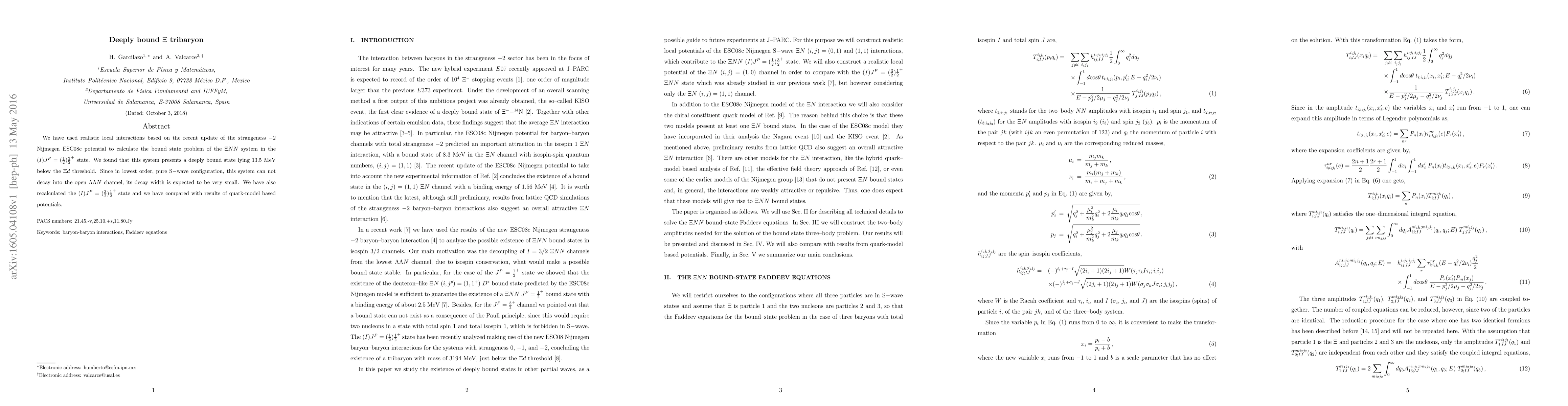 We have used realistic local interactions based on the recent update of the strangeness $-2$ Nijmegen ESC08c potential to calculate the bound state problem of the $\Xi NN$ system in the $(I)J^P=(\frac{1}{2})\frac{3}{2}^+$ state. We found that this system presents a deeply bound state lying $13.5$ MeV below the $\Xi d$ threshold. Since in lowest order, pure S$-$wave configuration, this system can not decay into the open $\Lambda\Lambda N$ channel, its decay width is expected to be very small. We have also recalculated the $(I)J^P=(\frac{3}{2})\frac{1}{2}^+$ state and we have compared with results of quark-model based potentials.