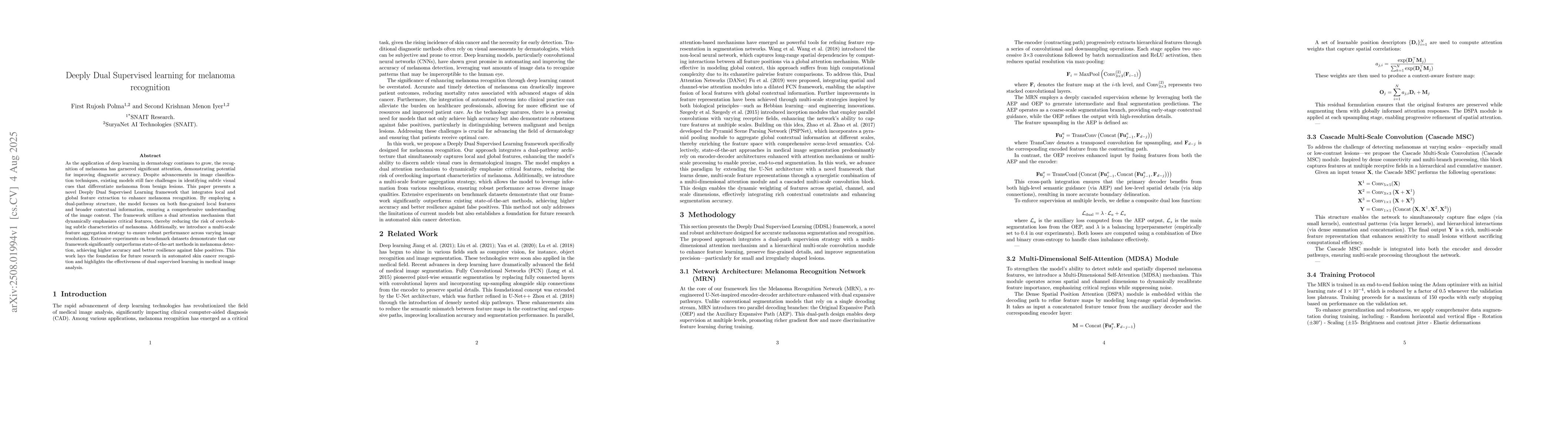 As the application of deep learning in dermatology continues to grow, the recognition of melanoma has garnered significant attention, demonstrating potential for improving diagnostic accuracy. Despite advancements in image classification techniques, existing models still face challenges in identifying subtle visual cues that differentiate melanoma from benign lesions. This paper presents a novel Deeply Dual Supervised Learning framework that integrates local and global feature extraction to enhance melanoma recognition. By employing a dual-pathway structure, the model focuses on both fine-grained local features and broader contextual information, ensuring a comprehensive understanding of the image content. The framework utilizes a dual attention mechanism that dynamically emphasizes critical features, thereby reducing the risk of overlooking subtle characteristics of melanoma. Additionally, we introduce a multi-scale feature aggregation strategy to ensure robust performance across varying image resolutions. Extensive experiments on benchmark datasets demonstrate that our framework significantly outperforms state-of-the-art methods in melanoma detection, achieving higher accuracy and better resilience against false positives. This work lays the foundation for future research in automated skin cancer recognition and highlights the effectiveness of dual supervised learning in medical image analysis.
