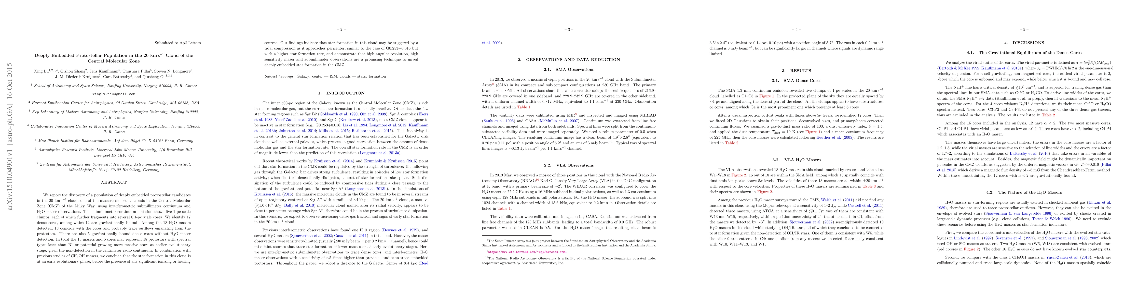 This study identifies a population of deeply embedded protostellar candidates in the 20 km s$^{-1}$ cloud of the Central Molecular Zone using submillimeter and H$_2$O maser observations, revealing 18 potential protostars at an early evolutionary phase likely triggered by tidal compression. High angular resolution observations suggest this method is effective for uncovering star formation in the CMZ.
