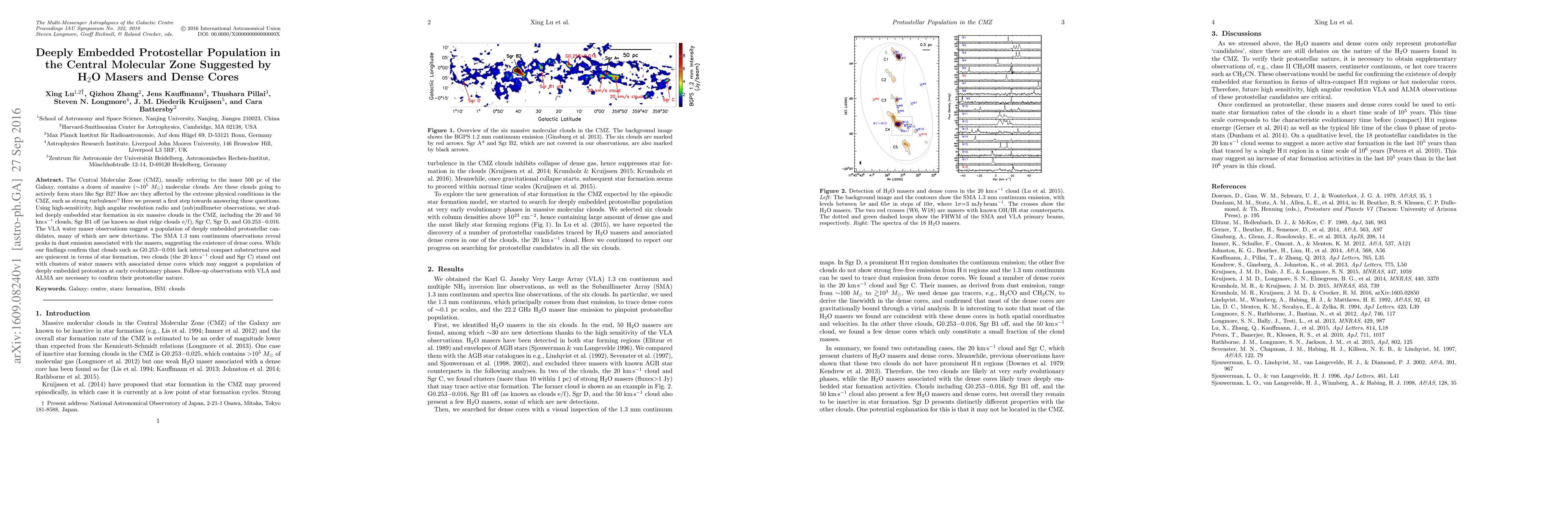 The Central Molecular Zone (CMZ), usually referring to the inner 500 pc of the Galaxy, contains a dozen of massive ($\sim10^5$ $M_\odot$) molecular clouds. Are these clouds going to actively form stars like Sgr B2? How are they affected by the extreme physical conditions in the CMZ, such as strong turbulence? Here we present a first step towards answering these questions. Using high-sensitivity, high angular resolution radio and (sub)millimeter observations, we studied deeply embedded star formation in six massive clouds in the CMZ, including the 20 and 50 km s$^{-1}$ clouds, Sgr B1 off (as known as dust ridge clouds e/f), Sgr C, Sgr D, and G0.253-0.016. The VLA water maser observations suggest a population of deeply embedded protostellar candidates, many of which are new detections. The SMA 1.3 mm continuum observations reveal peaks in dust emission associated with the masers, suggesting the existence of dense cores. While our findings confirm that clouds such as G0.253-0.016 lack internal compact substructures and are quiescent in terms of star formation, two clouds (the 20 km s$^{-1}$ cloud and Sgr C) stand out with clusters of water masers with associated dense cores which may suggest a population of deeply embedded protostars at early evolutionary phases. Follow-up observations with VLA and ALMA are necessary to confirm their protostellar nature.