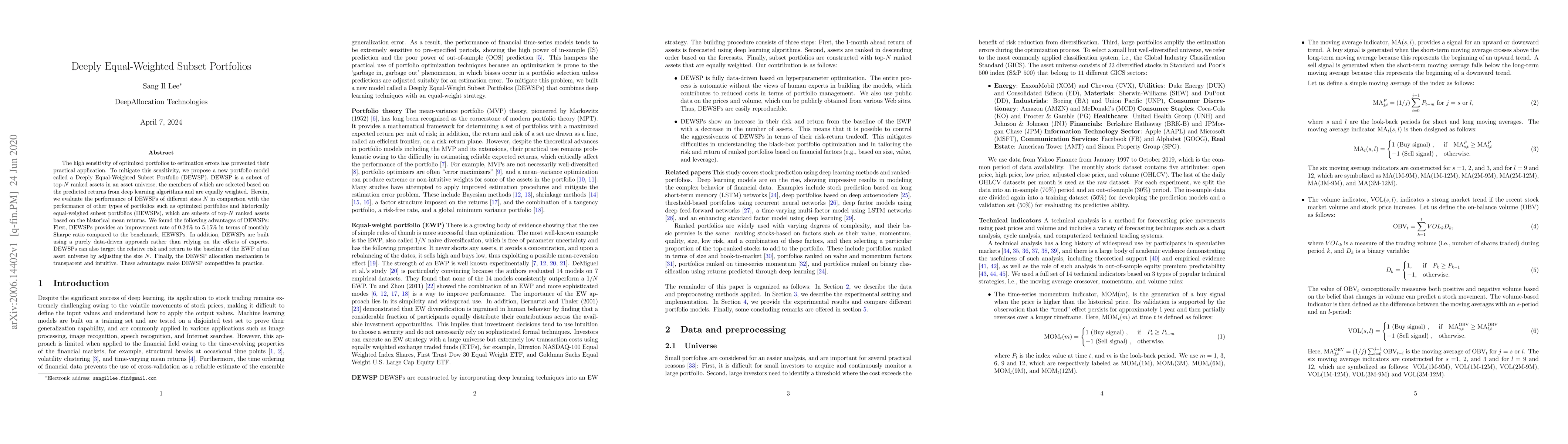 The high sensitivity of optimized portfolios to estimation errors has prevented their practical application. To mitigate this sensitivity, we propose a new portfolio model called a Deeply Equal-Weighted Subset Portfolio (DEWSP). DEWSP is a subset of top-N ranked assets in an asset universe, the members of which are selected based on the predicted returns from deep learning algorithms and are equally weighted. Herein, we evaluate the performance of DEWSPs of different sizes N in comparison with the performance of other types of portfolios such as optimized portfolios and historically equal-weighed subset portfolios (HEWSPs), which are subsets of top-N ranked assets based on the historical mean returns. We found the following advantages of DEWSPs: First, DEWSPs provides an improvement rate of 0.24% to 5.15% in terms of monthly Sharpe ratio compared to the benchmark, HEWSPs. In addition, DEWSPs are built using a purely data-driven approach rather than relying on the efforts of experts. DEWSPs can also target the relative risk and return to the baseline of the EWP of an asset universe by adjusting the size N. Finally, the DEWSP allocation mechanism is transparent and intuitive. These advantages make DEWSP competitive in practice.