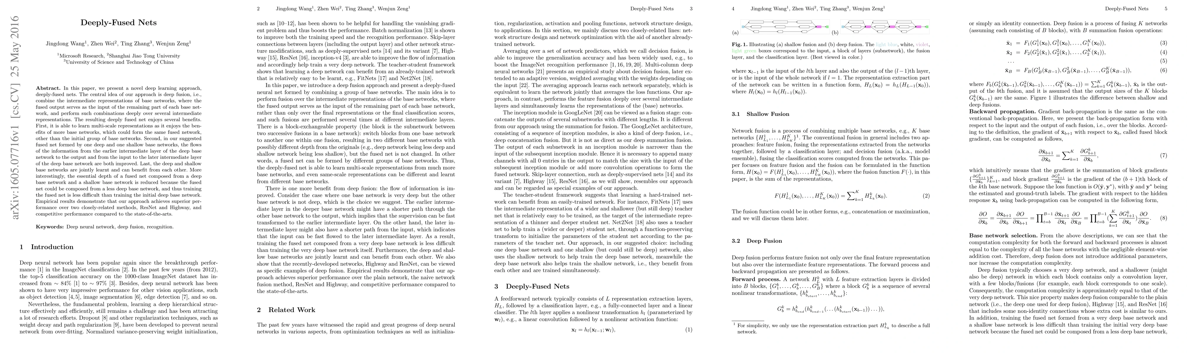 In this paper, we present a novel deep learning approach, deeply-fused nets. The central idea of our approach is deep fusion, i.e., combine the intermediate representations of base networks, where the fused output serves as the input of the remaining part of each base network, and perform such combinations deeply over several intermediate representations. The resulting deeply fused net enjoys several benefits. First, it is able to learn multi-scale representations as it enjoys the benefits of more base networks, which could form the same fused network, other than the initial group of base networks. Second, in our suggested fused net formed by one deep and one shallow base networks, the flows of the information from the earlier intermediate layer of the deep base network to the output and from the input to the later intermediate layer of the deep base network are both improved. Last, the deep and shallow base networks are jointly learnt and can benefit from each other. More interestingly, the essential depth of a fused net composed from a deep base network and a shallow base network is reduced because the fused net could be composed from a less deep base network, and thus training the fused net is less difficult than training the initial deep base network. Empirical results demonstrate that our approach achieves superior performance over two closely-related methods, ResNet and Highway, and competitive performance compared to the state-of-the-arts.