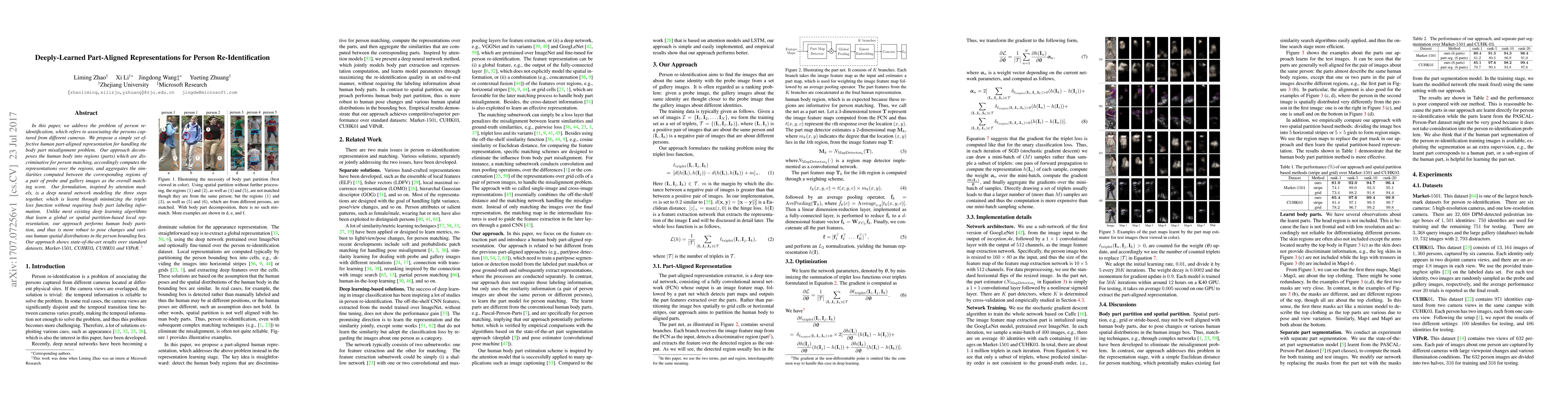 This paper proposes a deep learning model for person re-identification that uses part-aligned representations to address body part misalignment, achieving state-of-the-art results by decomposing the human body into discriminative regions and computing region-based matching scores. The method is robust to pose changes and does not require body part labeling.