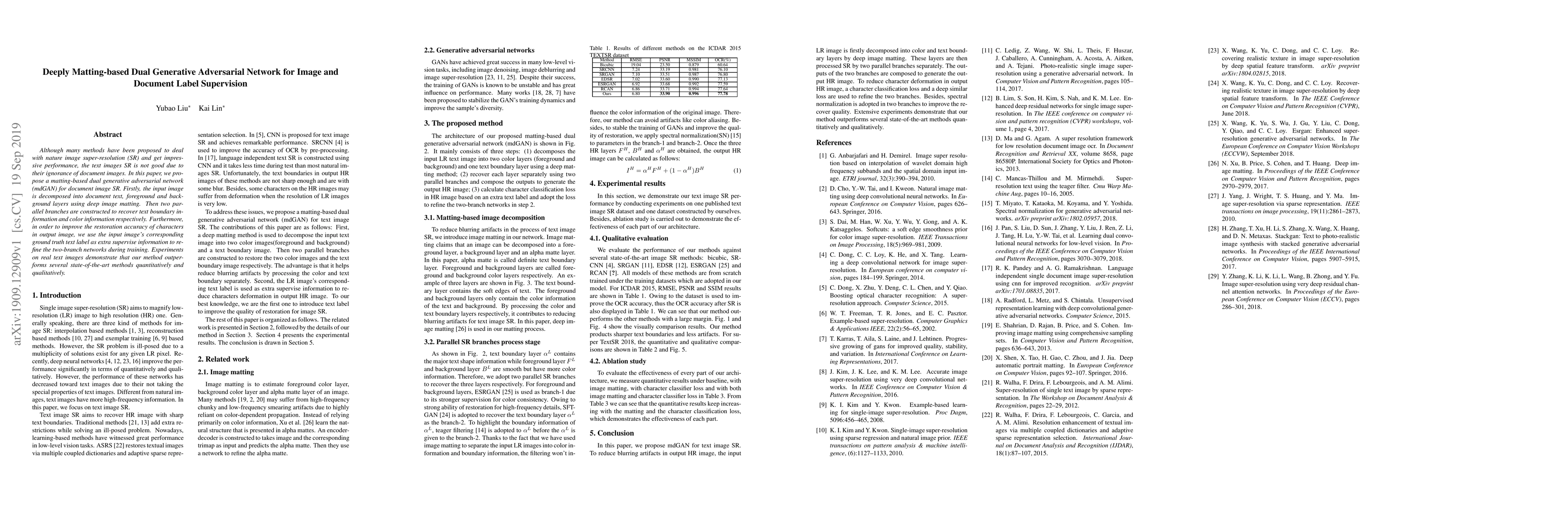 This paper proposes a matting-based dual generative adversarial network (mdGAN) to enhance the super-resolution of document images by decomposing them into text, foreground, and background layers. The method uses text label supervision to refine two parallel branches for text boundary and color information recovery, outperforming other state-of-the-art methods.