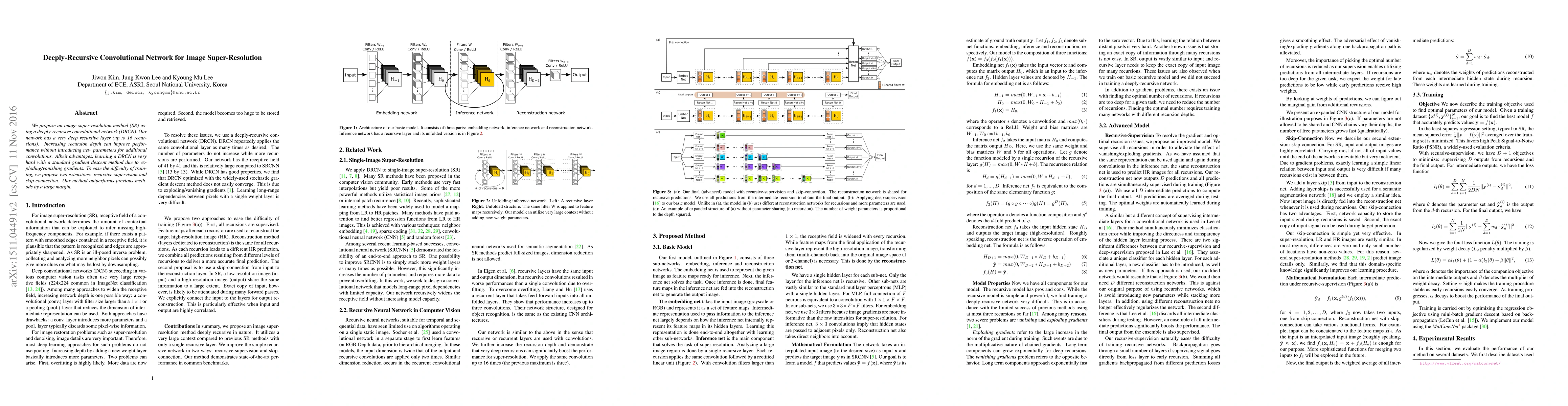 This paper introduces a deeply-recursive convolutional network (DRCN) for image super-resolution, utilizing up to 16 recursive layers to enhance performance without adding parameters. To address training difficulties due to gradient issues, the authors propose recursive-supervision and skip-connections, achieving superior results compared to previous methods.