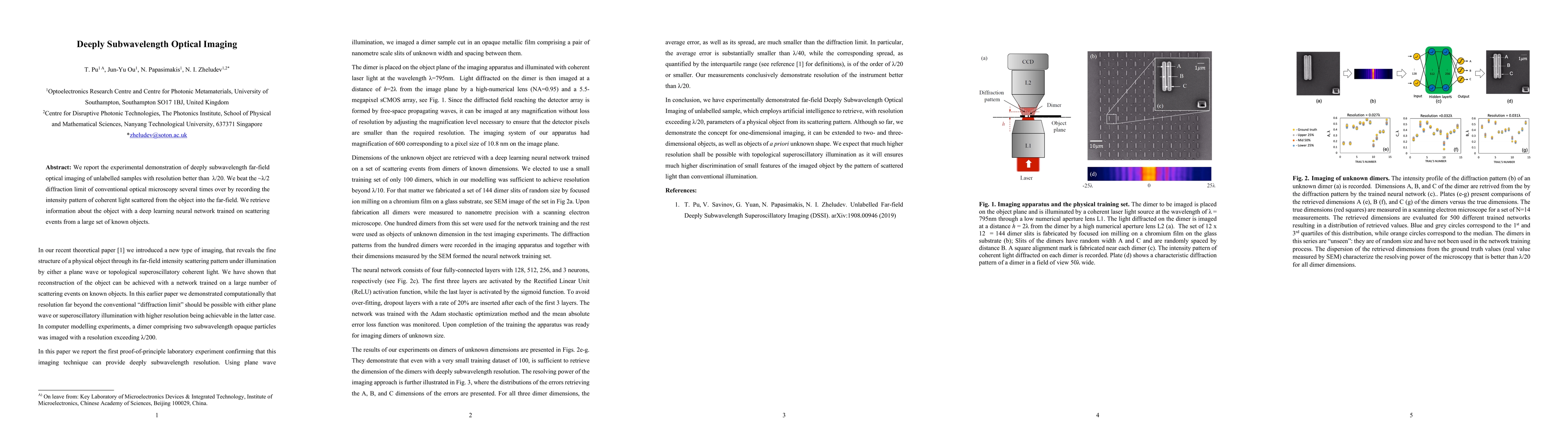 This research demonstrates deeply subwavelength optical imaging surpassing the $\lambda$/20 resolution, significantly outperforming conventional optical microscopy's diffraction limit, using a deep learning neural network trained on scattering data to retrieve object details.