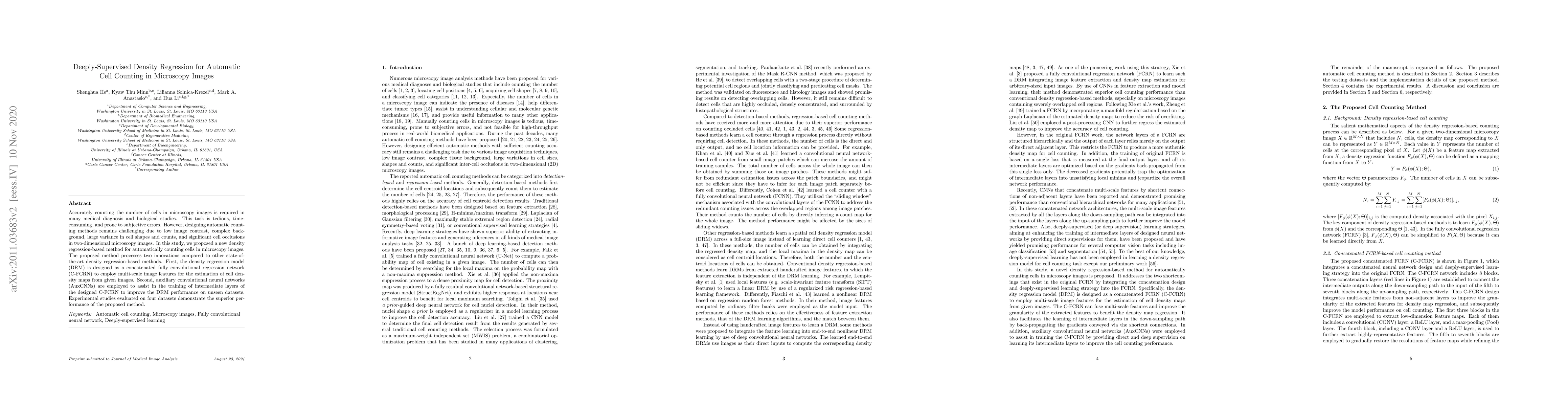 This paper proposes a new density regression-based method for automatic cell counting in microscopy images, utilizing a concatenated fully convolutional regression network (C-FCRN) and auxiliary convolutional neural networks (AuxCNNs) to enhance performance, achieving superior results on multiple datasets.