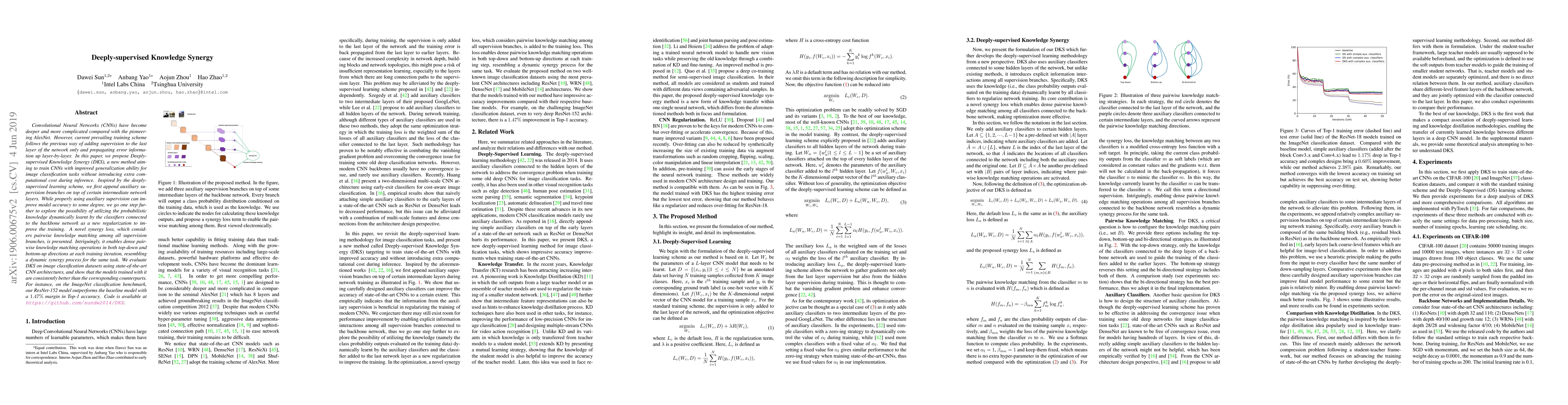 Convolutional Neural Networks (CNNs) have become deeper and more complicated compared with the pioneering AlexNet. However, current prevailing training scheme follows the previous way of adding supervision to the last layer of the network only and propagating error information up layer-by-layer. In this paper, we propose Deeply-supervised Knowledge Synergy (DKS), a new method aiming to train CNNs with improved generalization ability for image classification tasks without introducing extra computational cost during inference. Inspired by the deeply-supervised learning scheme, we first append auxiliary supervision branches on top of certain intermediate network layers. While properly using auxiliary supervision can improve model accuracy to some degree, we go one step further to explore the possibility of utilizing the probabilistic knowledge dynamically learnt by the classifiers connected to the backbone network as a new regularization to improve the training. A novel synergy loss, which considers pairwise knowledge matching among all supervision branches, is presented. Intriguingly, it enables dense pairwise knowledge matching operations in both top-down and bottom-up directions at each training iteration, resembling a dynamic synergy process for the same task. We evaluate DKS on image classification datasets using state-of-the-art CNN architectures, and show that the models trained with it are consistently better than the corresponding counterparts. For instance, on the ImageNet classification benchmark, our ResNet-152 model outperforms the baseline model with a 1.47% margin in Top-1 accuracy. Code is available at https://github.com/sundw2014/DKS.