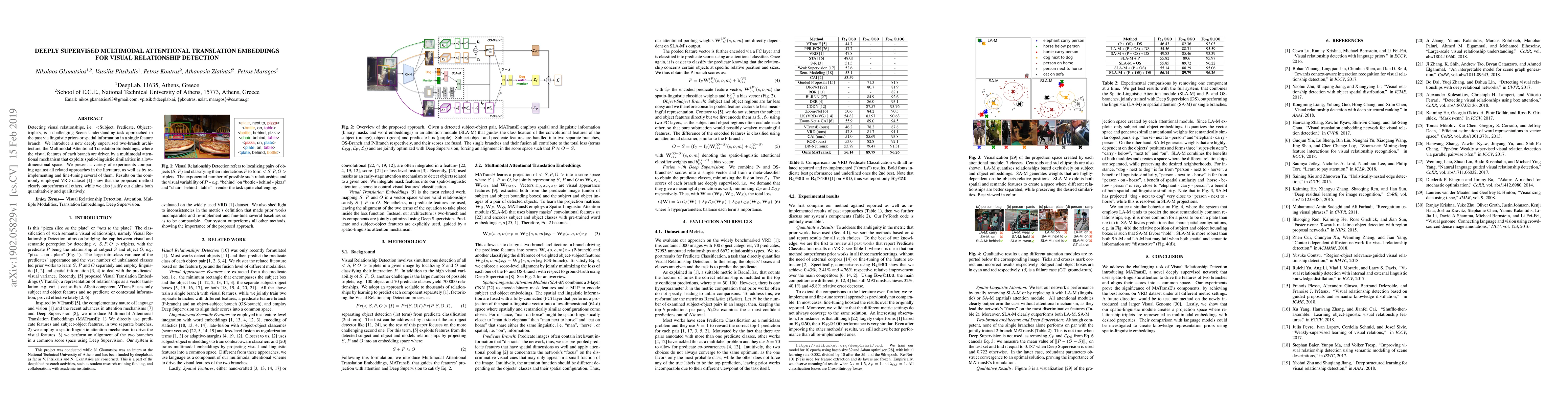 This paper introduces a deeply supervised two-branch architecture called Multimodal Attentional Translation Embeddings for detecting visual relationships. The method outperforms existing approaches by leveraging a multimodal attentional mechanism that exploits spatio-linguistic similarities, as demonstrated through extensive experiments on the VRD dataset.