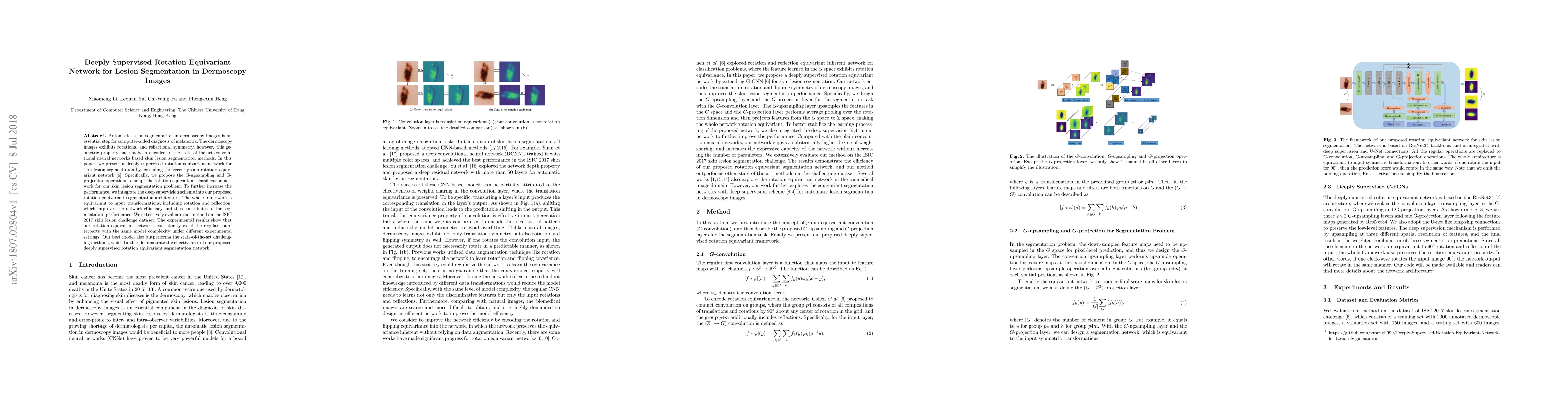 This paper introduces a deeply supervised rotation equivariant network for skin lesion segmentation in dermoscopy images, leveraging group rotation equivariant techniques and deep supervision to enhance performance. The proposed method outperforms existing methods on the ISIC 2017 dataset, achieving a Jaccard Overlap score of 77.23%.