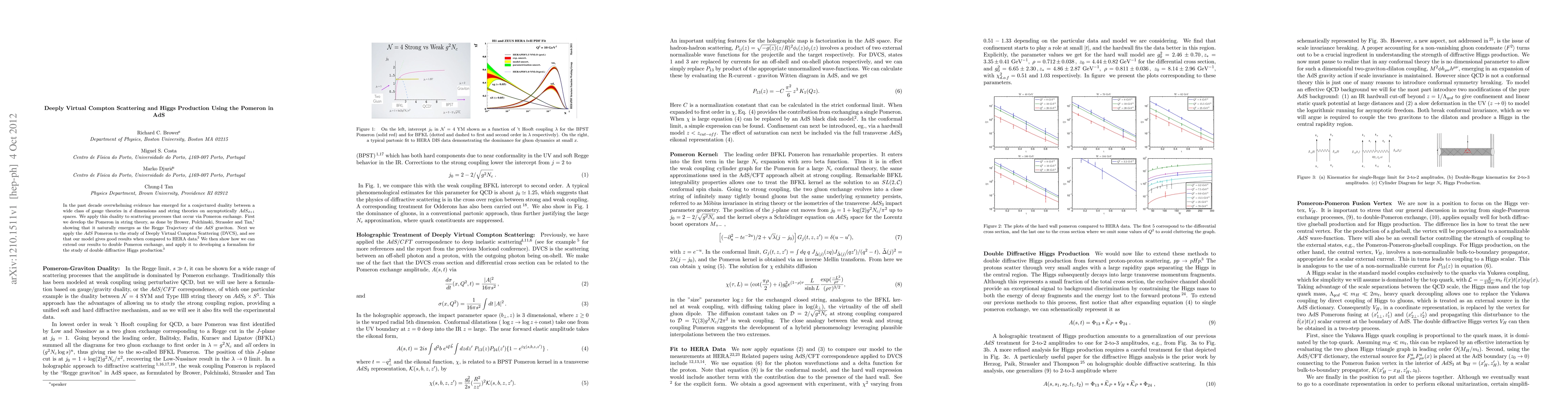 This paper explores the duality between gauge theories and string theories in AdS spaces, applying it to Pomeron exchange in scattering processes. It develops the Pomeron in string theory and uses it to model Deeply Virtual Compton Scattering, achieving good agreement with experimental data, and extends the approach to double Pomeron exchange for double diffractive Higgs production.