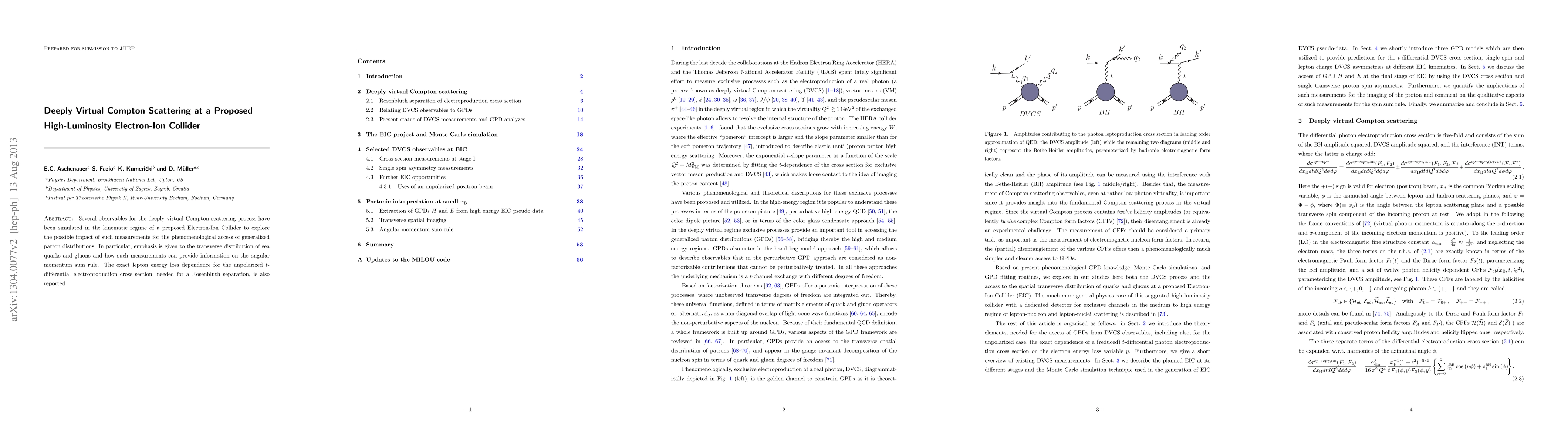 This paper simulates observables for deeply virtual Compton scattering at a proposed high-luminosity Electron-Ion Collider to assess their impact on generalized parton distributions, focusing on sea quarks and gluons' transverse distributions and their implications for the angular momentum sum rule. It also reports the lepton energy loss dependence for the unpolarized $t$-differential electroproduction cross section.