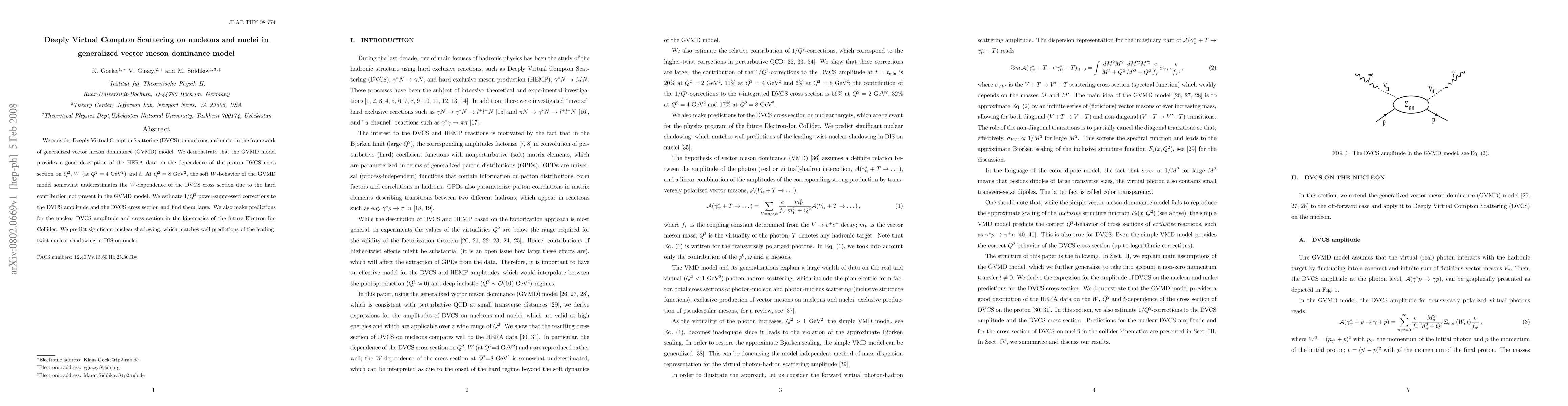 We consider Deeply Virtual Compton Scattering (DVCS) on nucleons and nuclei in the framework of generalized vector meson dominance (GVMD) model. We demonstrate that the GVMD model provides a good description of the HERA data on the dependence of the proton DVCS cross section on Q^2, W (at Q^2=4 GeV^2) and t. At Q^2 = 8 GeV^2, the soft W-behavior of the GVMD model somewhat underestimates the W-dependence of the DVCS cross section due to the hard contribution not present in the GVMD model. We estimate 1/Q^2 power-suppressed corrections to the DVCS amplitude and the DVCS cross section and find them large. We also make predictions for the nuclear DVCS amplitude and cross section in the kinematics of the future Electron-Ion Collider. We predict significant nuclear shadowing, which matches well predictions of the leading-twist nuclear shadowing in DIS on nuclei.
