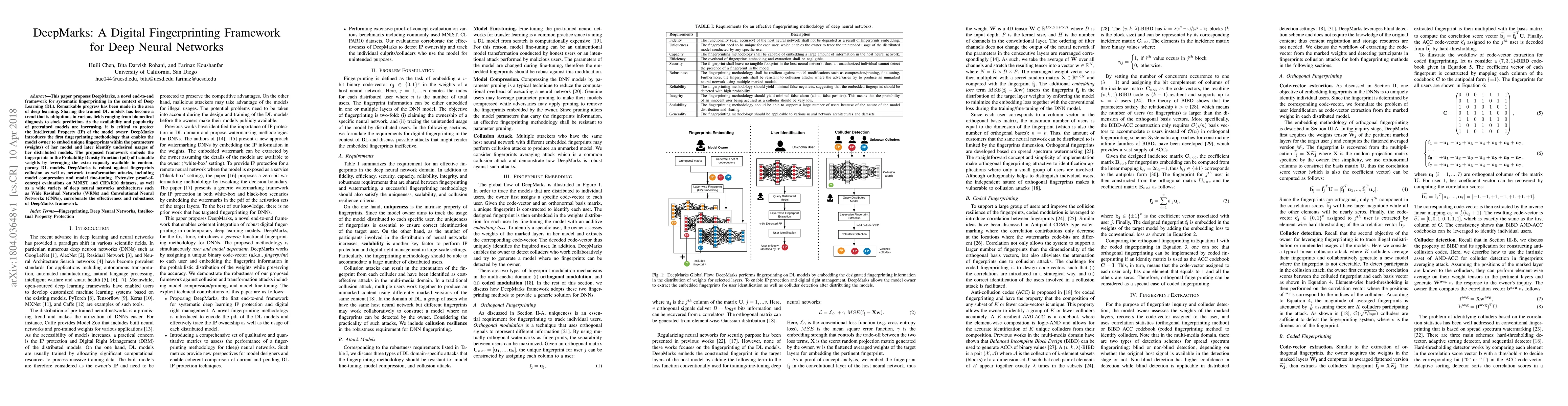 DeepMarks is a novel framework for embedding unique fingerprints in deep neural network parameters to protect intellectual property. It leverages the extra capacity in model weights to embed fingerprints robustly against collusion and network transformation attacks.