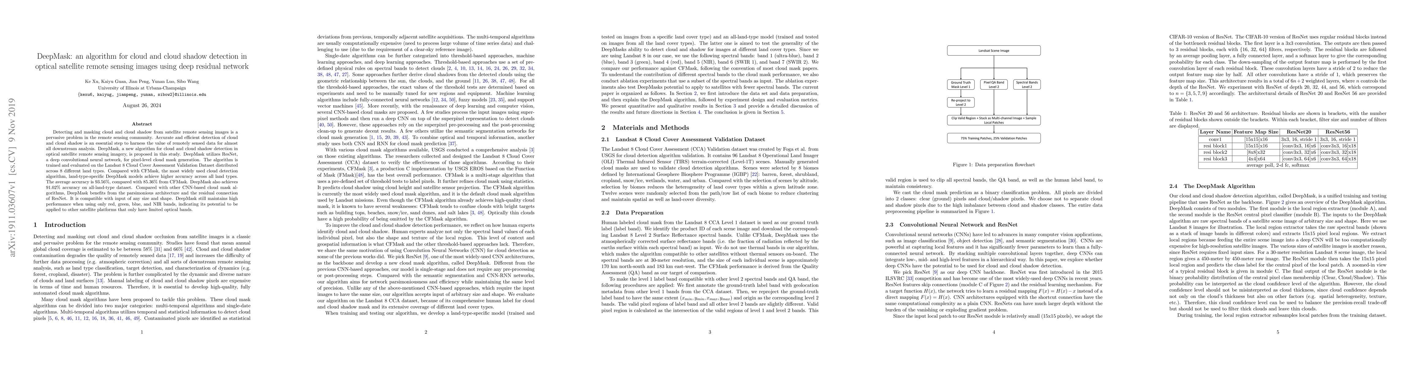 DeepMask is a novel deep residual network-based algorithm for cloud and cloud shadow detection in optical satellite imagery, achieving higher accuracy than CFMask across various land types. It maintains high performance with limited optical bands, making it versatile for different satellite platforms.