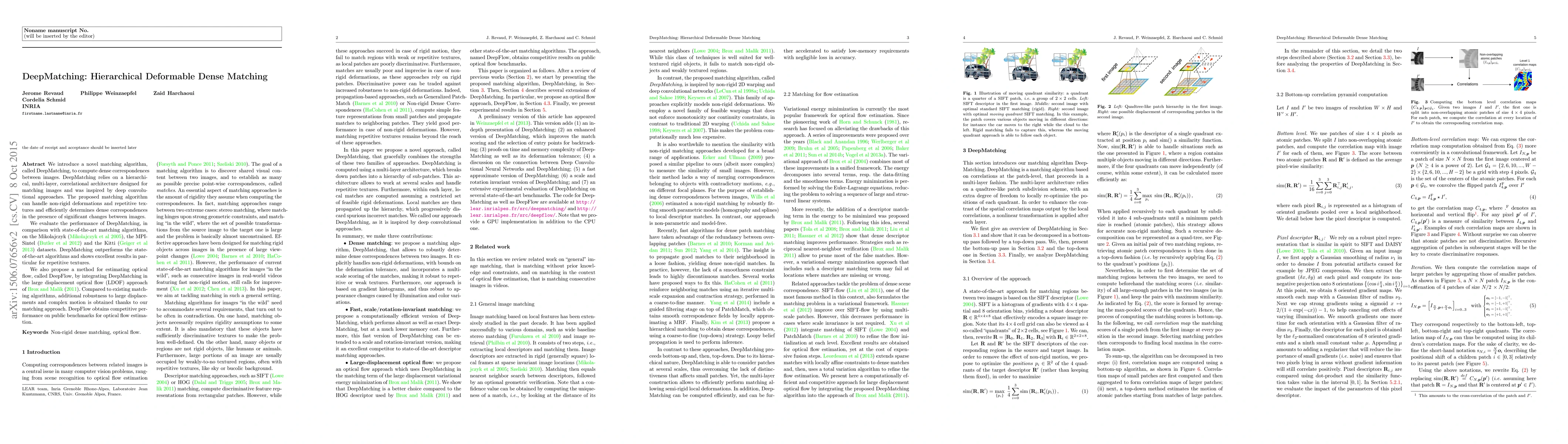 We introduce a novel matching algorithm, called DeepMatching, to compute dense correspondences between images. DeepMatching relies on a hierarchical, multi-layer, correlational architecture designed for matching images and was inspired by deep convolutional approaches. The proposed matching algorithm can handle non-rigid deformations and repetitive textures and efficiently determines dense correspondences in the presence of significant changes between images. We evaluate the performance of DeepMatching, in comparison with state-of-the-art matching algorithms, on the Mikolajczyk (Mikolajczyk et al 2005), the MPI-Sintel (Butler et al 2012) and the Kitti (Geiger et al 2013) datasets. DeepMatching outperforms the state-of-the-art algorithms and shows excellent results in particular for repetitive textures.We also propose a method for estimating optical flow, called DeepFlow, by integrating DeepMatching in the large displacement optical flow (LDOF) approach of Brox and Malik (2011). Compared to existing matching algorithms, additional robustness to large displacements and complex motion is obtained thanks to our matching approach. DeepFlow obtains competitive performance on public benchmarks for optical flow estimation.