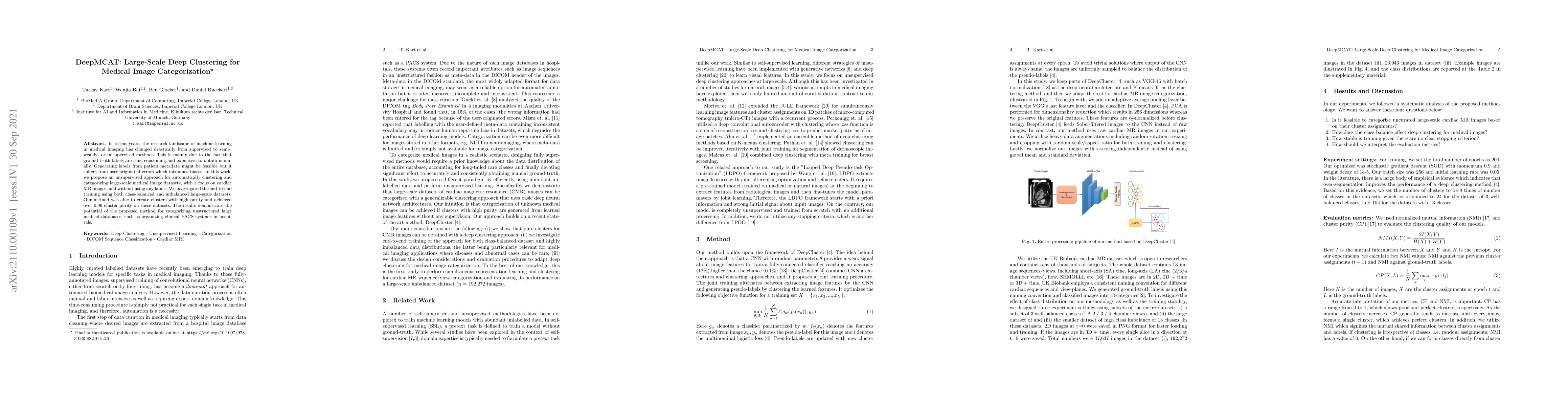 This paper proposes DeepMCAT, an unsupervised deep clustering method for categorizing large-scale medical image datasets, particularly cardiac MR images, without requiring any labels. The method achieved high cluster purity, demonstrating its potential for organizing unstructured medical databases.
